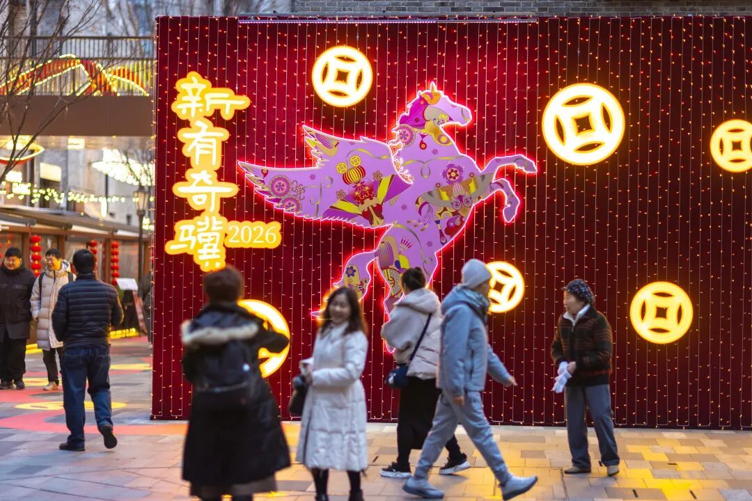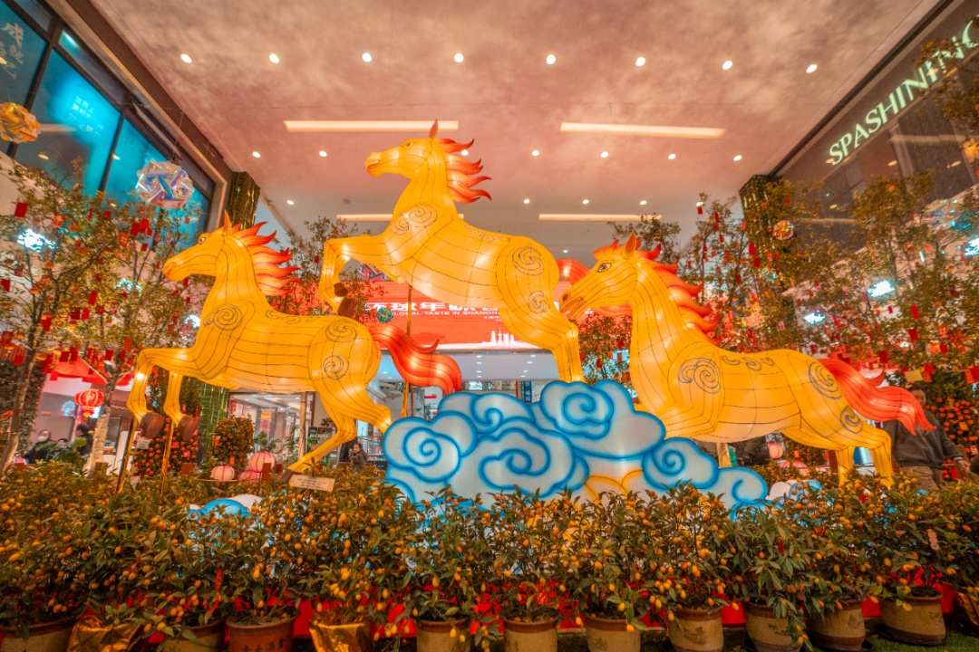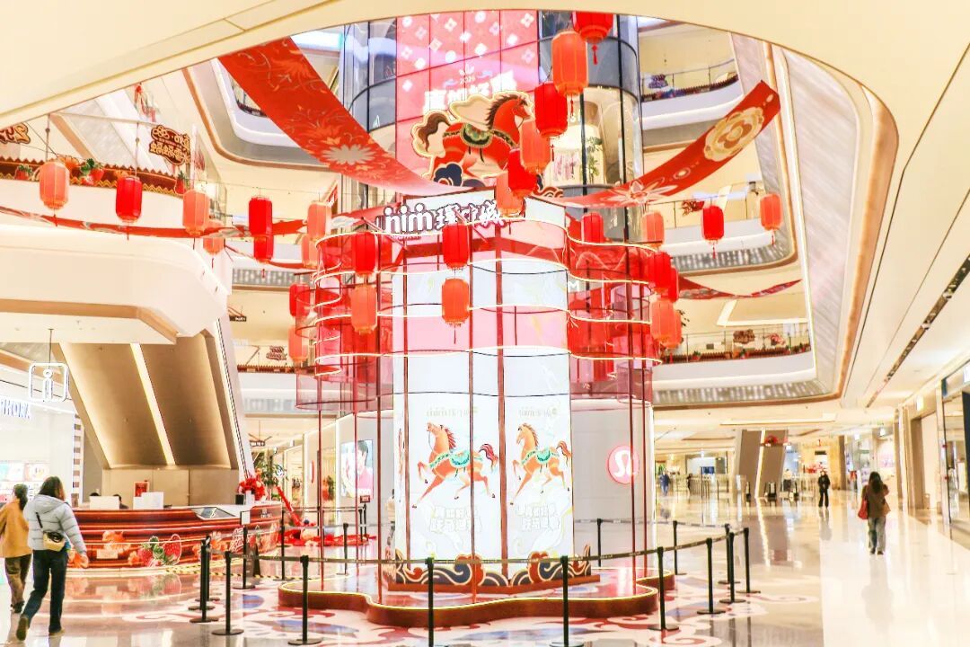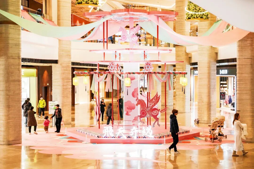 新春临近,年味愈发浓郁,漫步普陀街头,随处可见形式多样的马年元素装点其间,从喜庆的飞马雕塑到吉祥的骏马图案,处处洋溢着祥瑞气息,为市民带来满满的祝福与新春的欢愉。 普陀各大商圈更是卯足了劲,纷纷亮出各具特色的马年主题装置,风格迥异却同样吸睛。有的回归传统韵味,尽显龙马精神的磅礴气势;有的以时尚为底色,成为年轻人打卡的新地标;有的则主打联名创意,营造出步步皆景的沉浸式体验。 时尚与创意相融 不少商场创新的马年展陈成为吸睛焦点,凭借绚烂的色彩与灵动的造型,吸引众多市民驻足打卡。 在上海真如环宇城MAX1楼中庭广场,一座近8米高的新春非遗宫灯美陈格外吸睛,成为商圈最具辨识度的年味地标。这座宫灯美陈采用多层镂空结构搭建,灯体主视觉提取壁画中的飞天、祥云纹样,搭配鎏金、朱红、暖橙的传统配色,尽显典雅大气。 天安千树则巧妙结合马年主题,推出了“飞天奇遇”新春展陈。展陈以粉色为主色调,打造出多层旋转木马造型的装置,粉色的飞马带着祥云图案翩然欲飞,周围悬挂着轻柔的彩带与古风灯笼,整个场景将传统元素与现代艺术完美融合,温馨唯美。 鸿寿坊披上了喜庆的盛装,大型展板上,一匹紫色飞马跃然眼前,身上装饰着精美的花纹,周围环绕着金色的铜钱图案,寓意着新的一年将有奇迹降临。一旁一盏盏暖黄色的灯笼整齐排列,柔和的灯光透过竹编灯罩,营造出浓厚的传统年味氛围。 桃源π商业广场内,入口拱门上方,心形镂空内铺满亮片,拱门之下,以红色为主色调的新年展陈亮丽温馨,红色蝴蝶结洋溢着喜庆,马年生肖造型搭配“新年快乐”的白色大字,传递出浓浓的节日祝福。 传统与文化辉映 创意美陈引人眼球,传统年味也不遑多让。一些商圈凭借祥瑞大气的视觉呈现与深厚的文化内涵,营造出喜庆祥和的浓浓年味。 上海环球港内,以 “中国红” 为主调的新春装饰贯穿整个商场中庭,将传统喜庆与摩登商业空间完美融合,营造出 “抬头见喜、步步迎新” 的沉浸式氛围。大红灯笼错落悬挂,灯笼间串联着层层叠叠的小红灯笼串,从顶层直抵中庭地面,形成 “红韵通天” 的震撼视觉效果。 在百联中环购物广场,三匹金色的骏马造型花灯昂首挺立,鬃毛与尾巴似火焰般飞扬,身上精美的纹饰熠熠生辉,引得不少顾客驻足观赏、拍照留念。 长风大悦城内,一座青鸾主题灯饰惊艳亮相,伫立于一座中式传统风格的亭台之上,亭台周身装饰着祥云、羽毛等图案,色彩明快活泼,成为商场里的绝美风景。 LOVE大都会商圈内,巨大的锦鲤造型装饰灵动鲜活,仿佛正跃向新春的福祉;憨态可掬的雪人装置笑容满面,传递着冬日里的温暖与欢乐,为市民带来一场充满年味的新春盛宴。 童趣与潮流碰撞 信泰中心商场内,马年新春的欢乐氛围被创意展陈装点得格外灵动。这些作品源于与知名治愈系插画师弓长张的深度合作,其作品以“治愈童真”风格著称。弓长张为信泰中心商场独家创作并首发了系列小马形象IP,使之成为贯穿整个乐园的视觉向导与情感纽带。 复悦荟商场在新春之际化身为年味十足的欢乐场。户外,巨大的“梦马”IP在这里独家呈现,可爱的小马抱着橙黄相间的“福袋”,憨态可掬,“以梦为马”的字样满含美好期许。室内,红鳞熠熠的锦鲤造型装饰昂首摆尾,仿佛在迎接新春的欢歌,洋溢着喜庆的节日氛围。