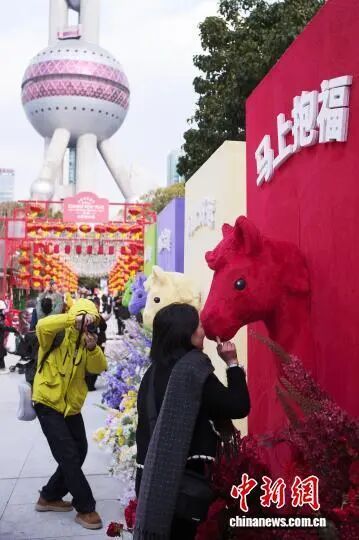 2月7日,游客在市集的马年主题装饰背景墙前合影。中新社记者 殷立勤 摄
