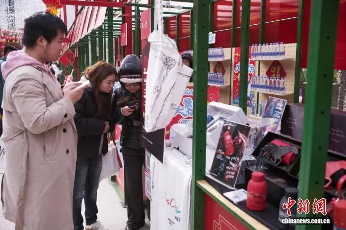 2月7日,游客在市集的“福”字主题装饰背景墙前合影。中新社记者 殷立勤 摄