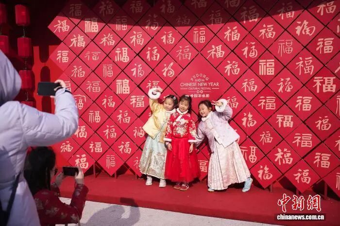 2月7日,孩子们在市集的“福”字主题装饰背景墙前合影。中新社记者 殷立勤 摄