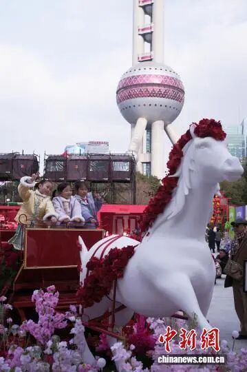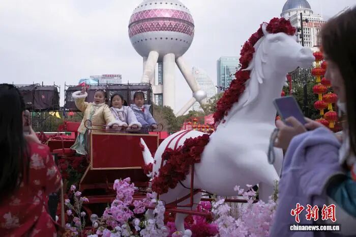 2月7日,孩子们站在装饰“马车”上合影。中新社记者 殷立勤 摄