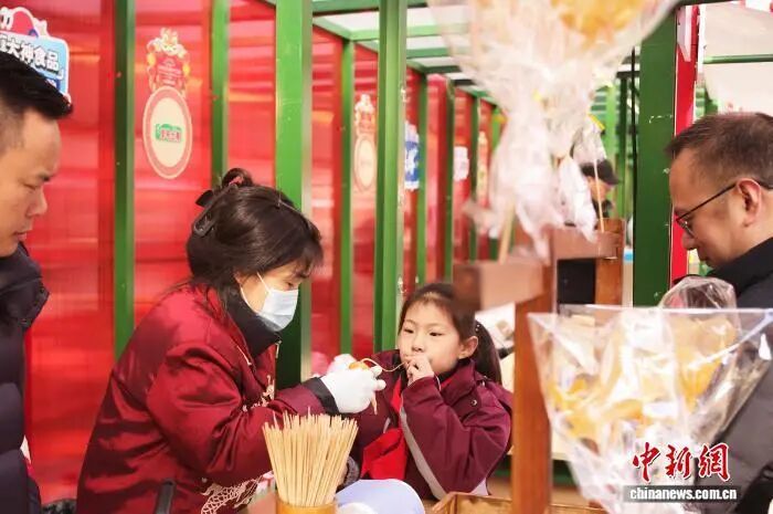 2月7日,游客带着孩子在市集看糖画制作。中新社记者 殷立勤 摄