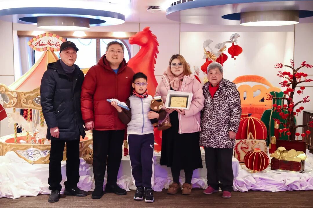现场,来自上海的李女士接过象征荣耀的纪念证书与邮轮专属礼遇,在镜头前定格下这百万分之一的邂逅。“非常激动,甚至有点不敢相信!原本只是一家五口来旅行,没想到成为了第100万名游客。”李女士难掩喜悦,“马上也要过年了,选择‘爱达・魔都号’因为它是第一艘国产大型邮轮,特地来感受下船上地道的年味。”