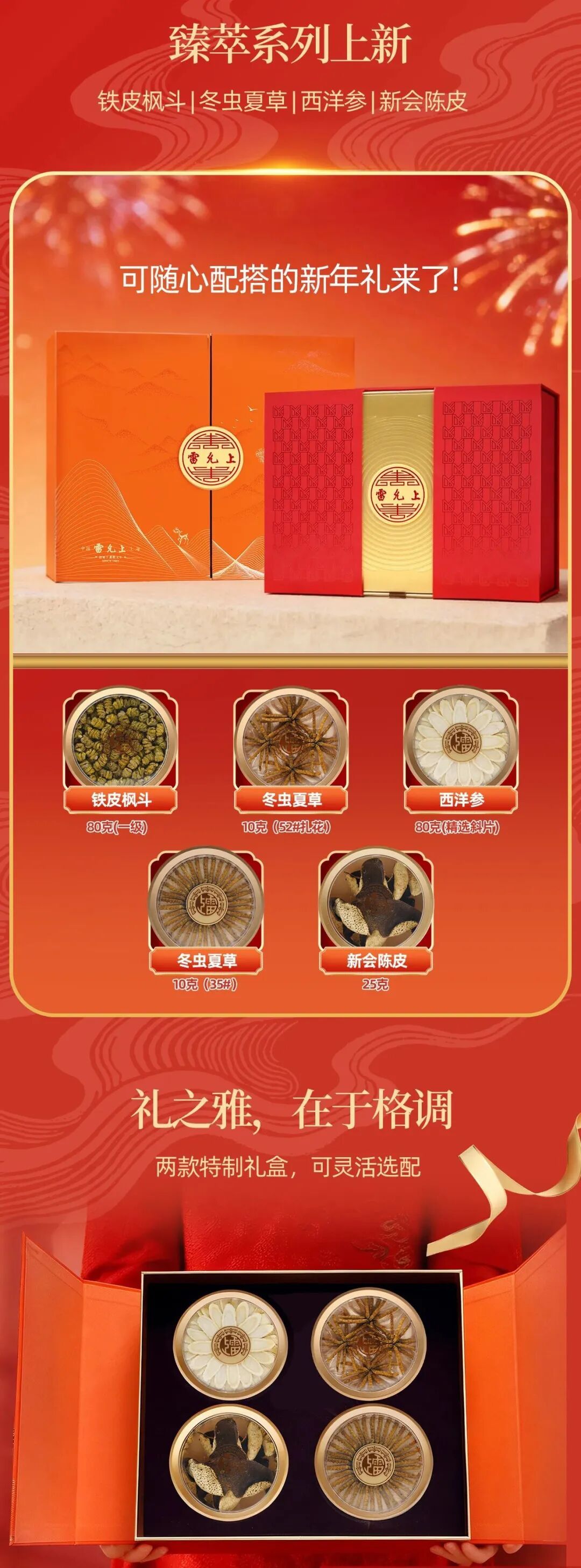 “臻萃系列”滋补礼精选铁皮枫斗、冬虫夏草、西洋参、新会陈皮等优质食材,搭配“金罐纳珍”礼盒,可灵活选配组合,无论是自留养生还是馈赠亲友,都尽显格调。