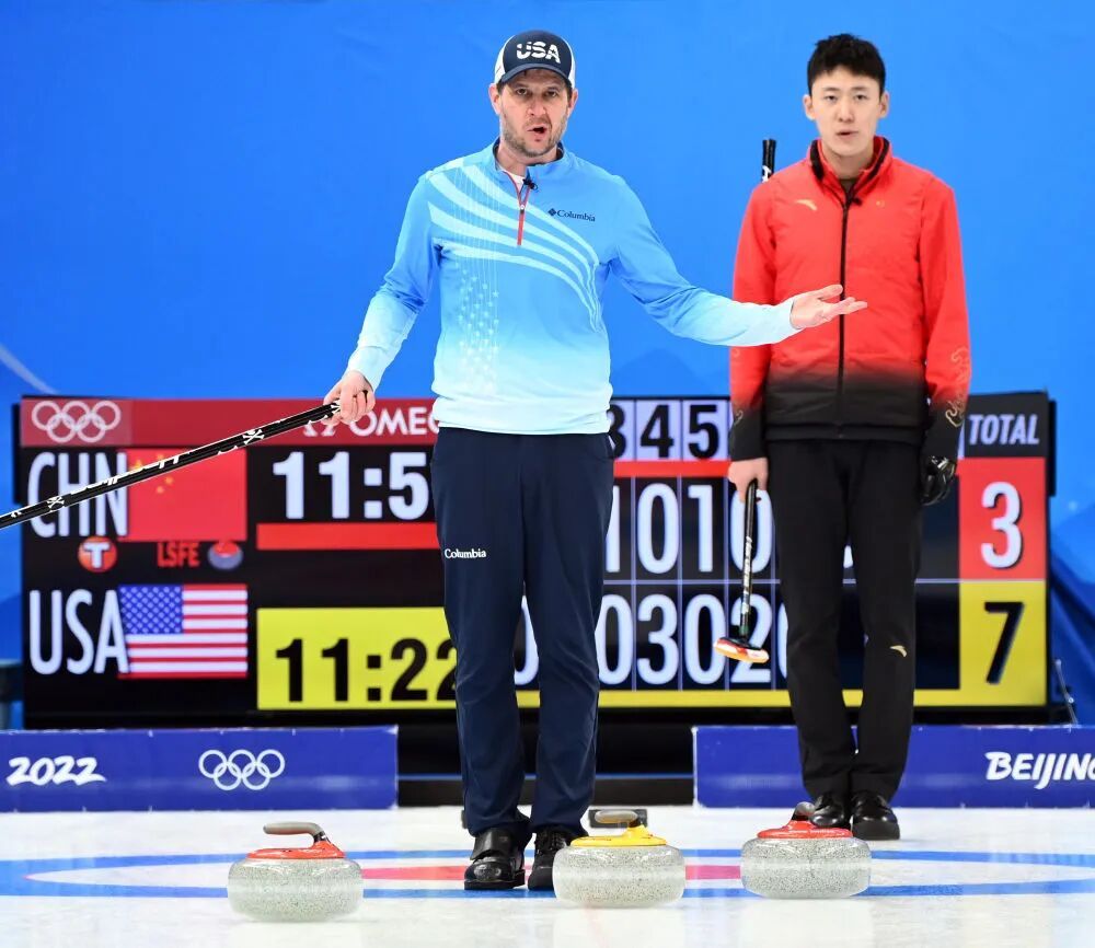 在“冰立方”举行的北京冬奥会男子冰壶循环赛中,中国队以6:8负于美国队
