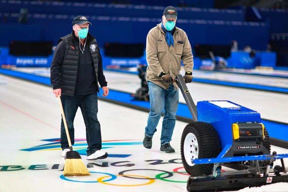 2022年北京冬奥会时,制冰师汉斯·乌斯里奇(左)在“冰立方”指导团队成员使用制冰设备