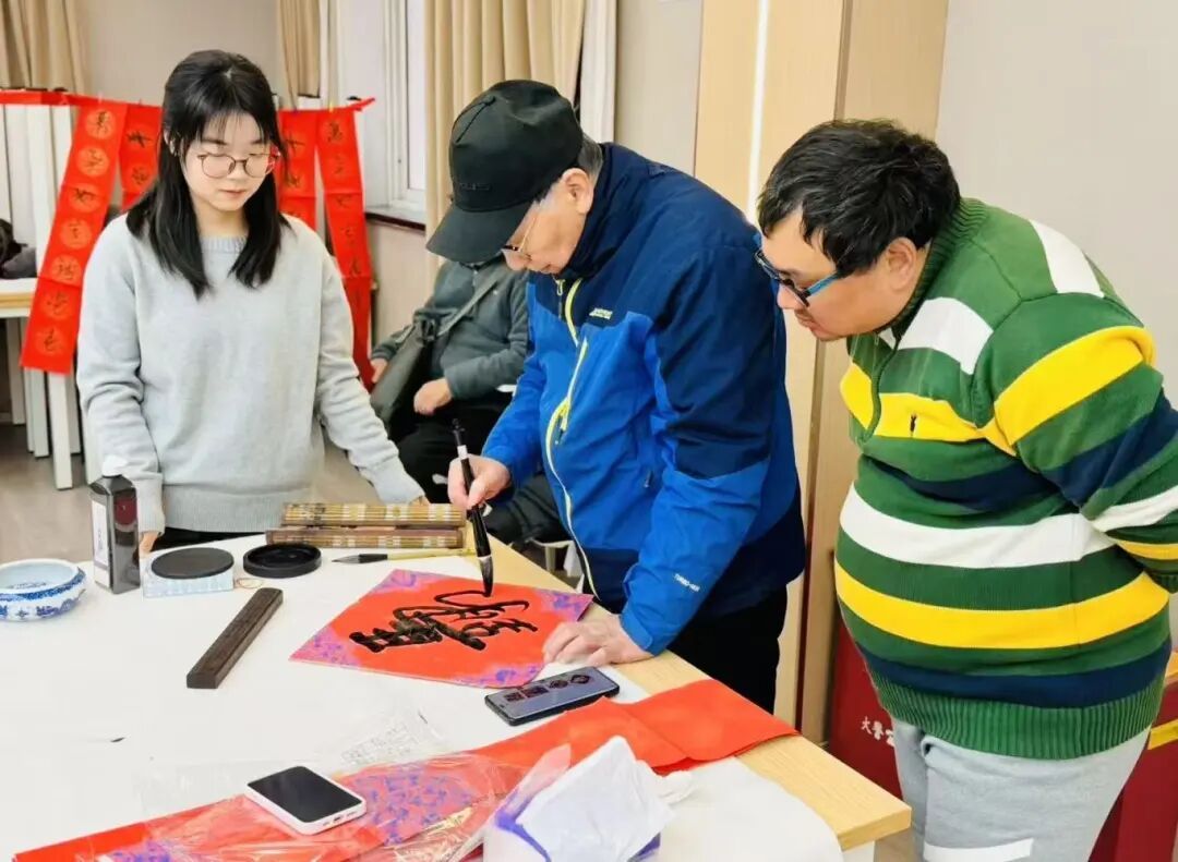 此外,游园会还设置了红包拓印、扎染共创等非遗手作体验项目。虹口区文化馆的书法家们还与残疾人书法爱好者共同挥毫,即兴创作春联与“福”字。活动现场气氛温馨,洋溢着参与者对新春的期盼以及对美好生活的祝愿。