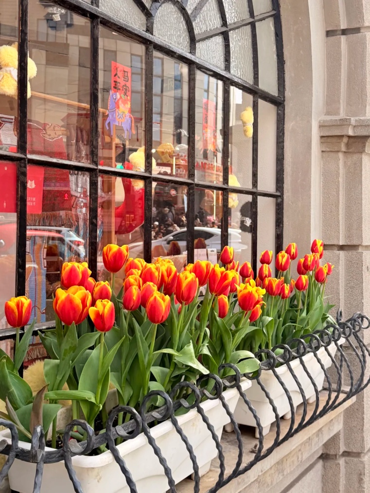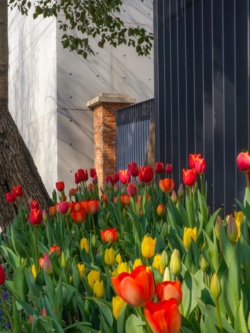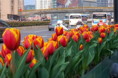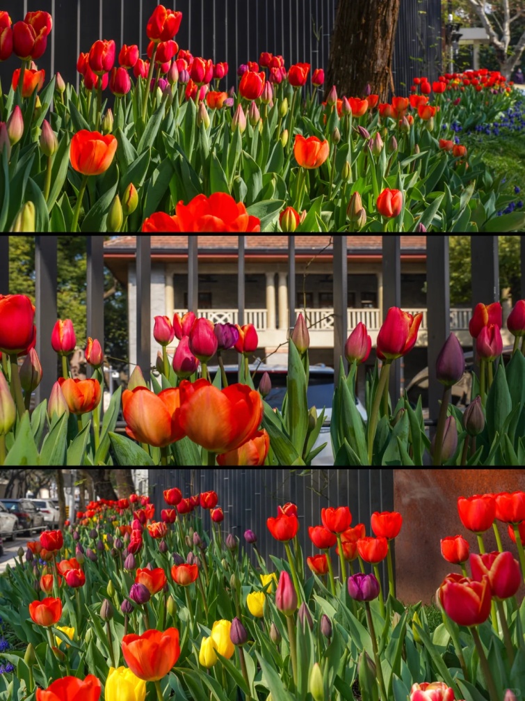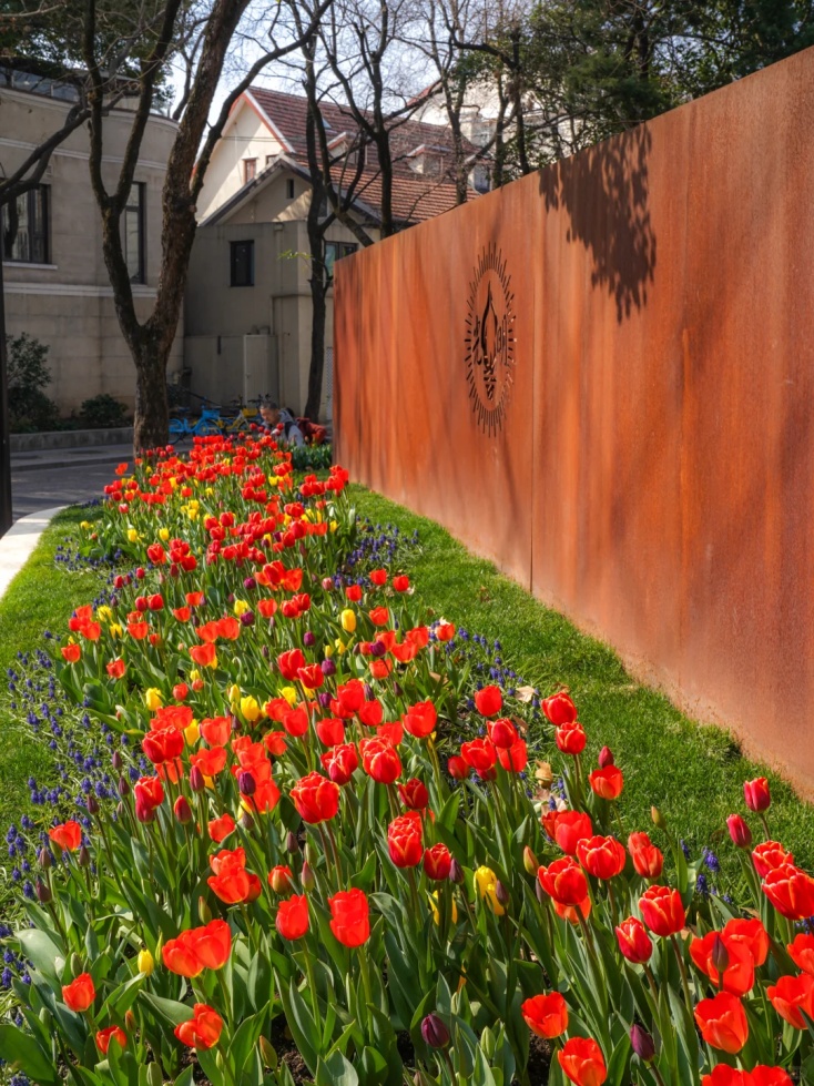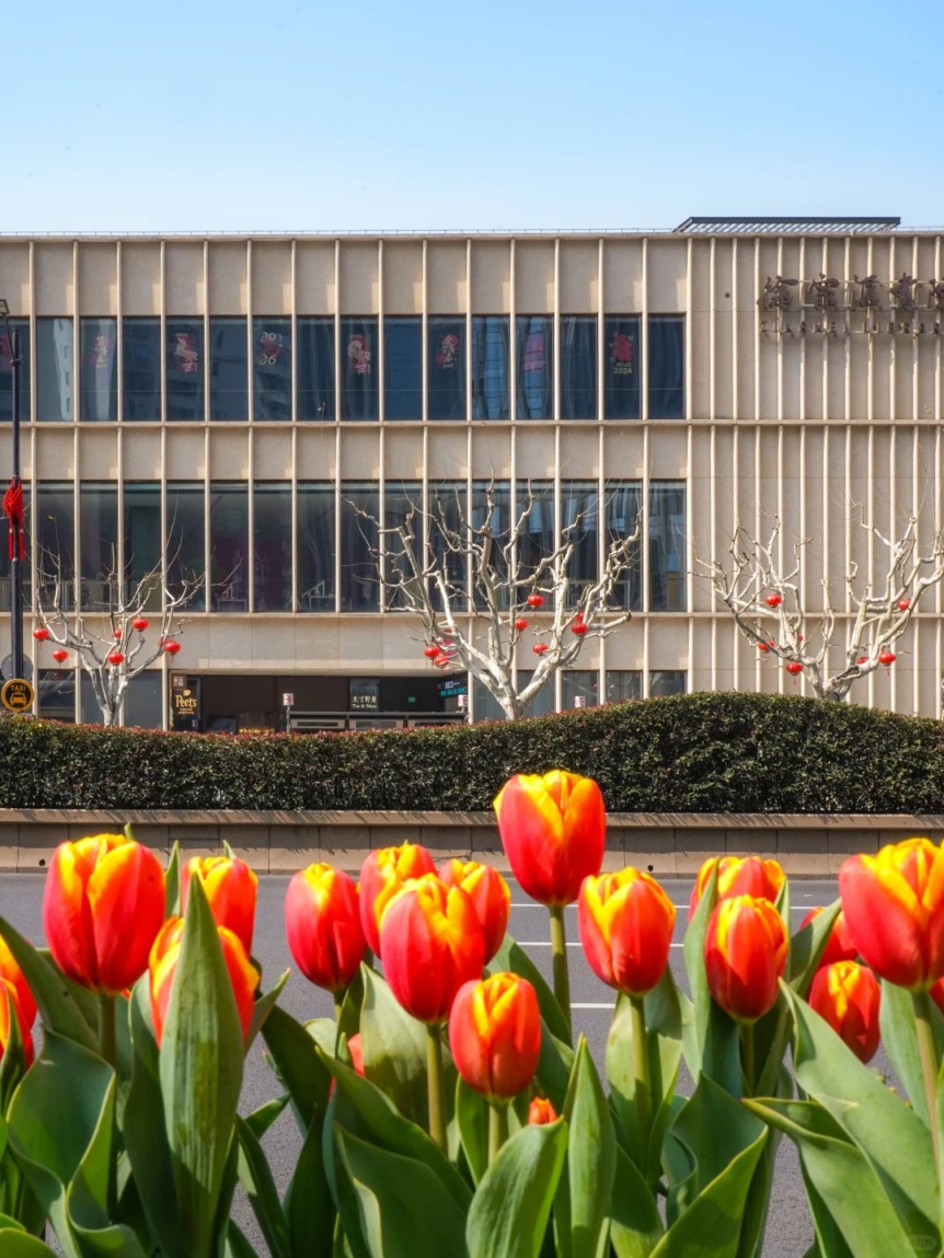 徐家汇沿路随处可见郁金香的身影,橙红色的花朵在徐家汇天主堂、徐家汇书院背景的衬托下,显得更加明媚热烈。
