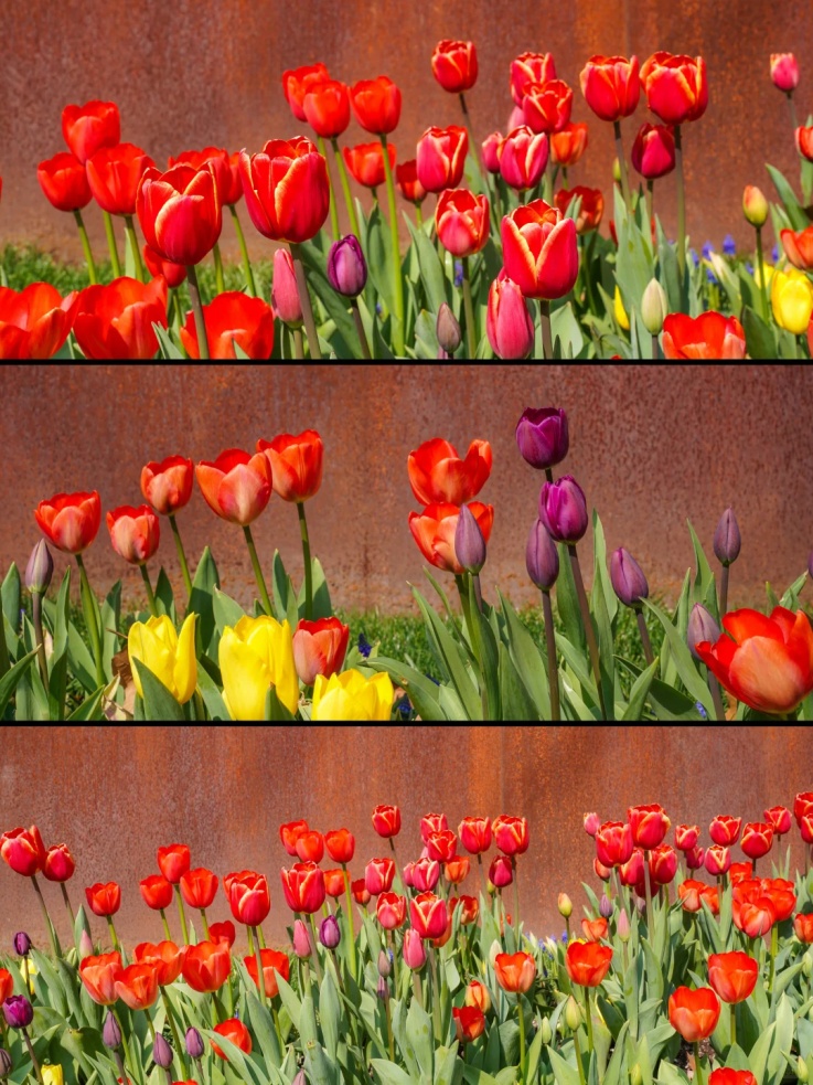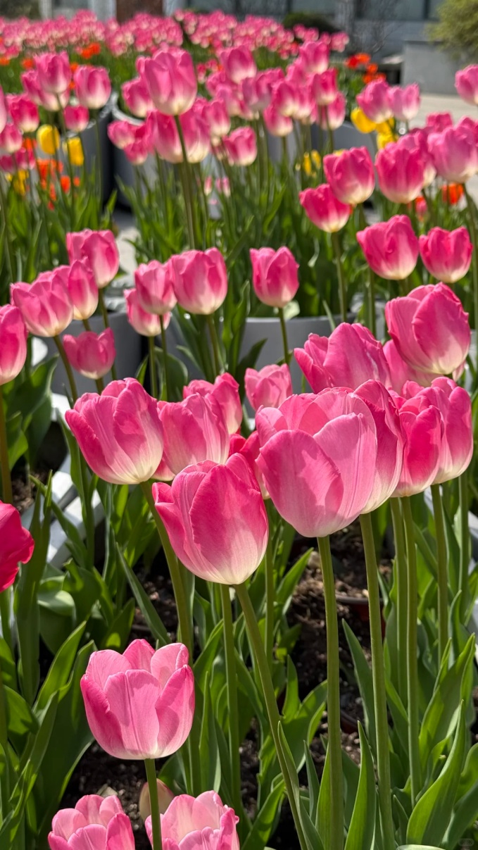 1号门入口附近,黄山石瀑布前的红色郁金香如火燃烧;植物大楼区域,可见那郁金香花海泛彩波,粉霞黄金,姿态万千。