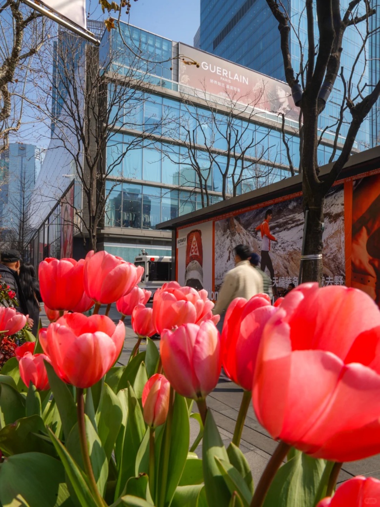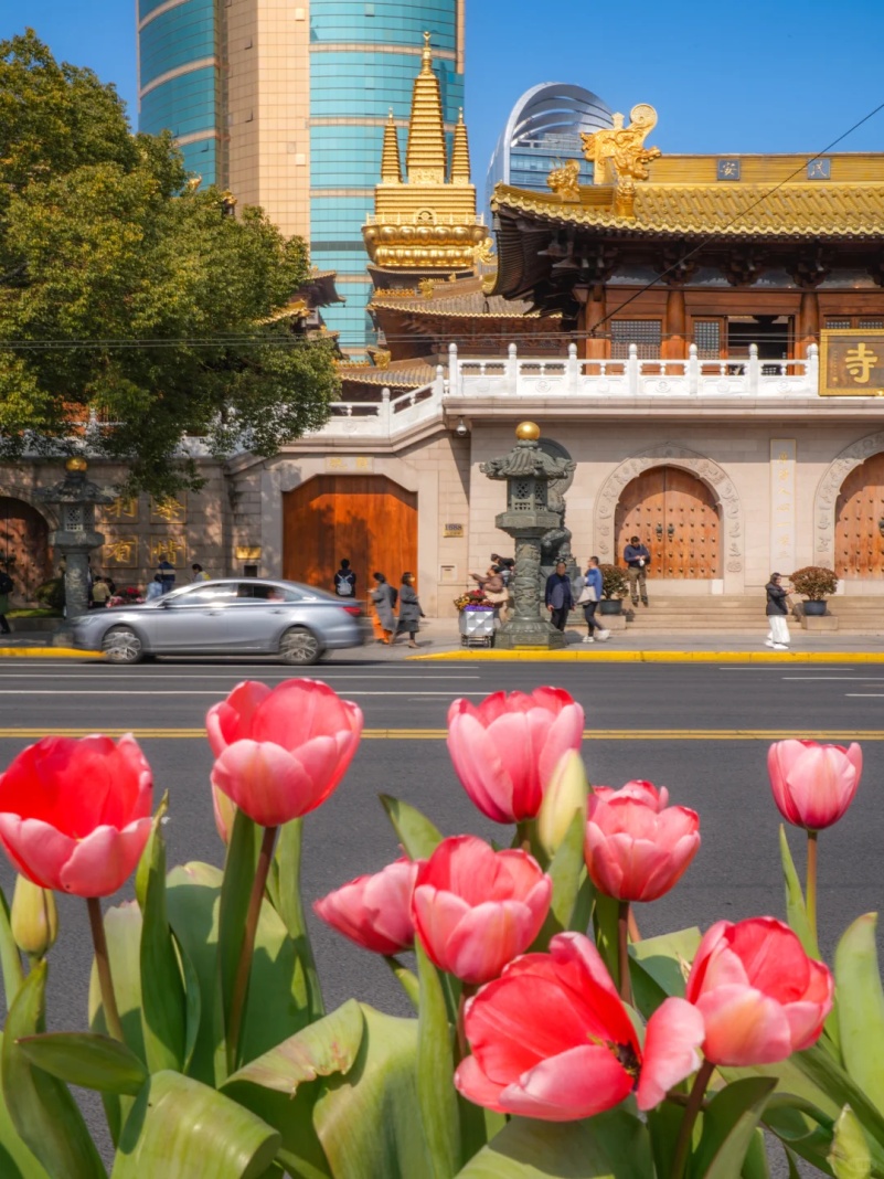 金顶古寺与现代商圈霓虹相映,郁金香成了古今碰撞的温柔媒介。