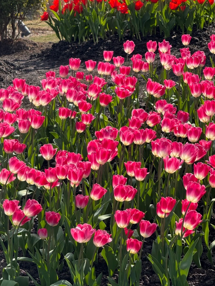 郁金香已经完全开放,展现出其优雅的花型和鲜艳的色彩。整齐划一的一抹红让沿路多了一份春光,给人一种美的享受。