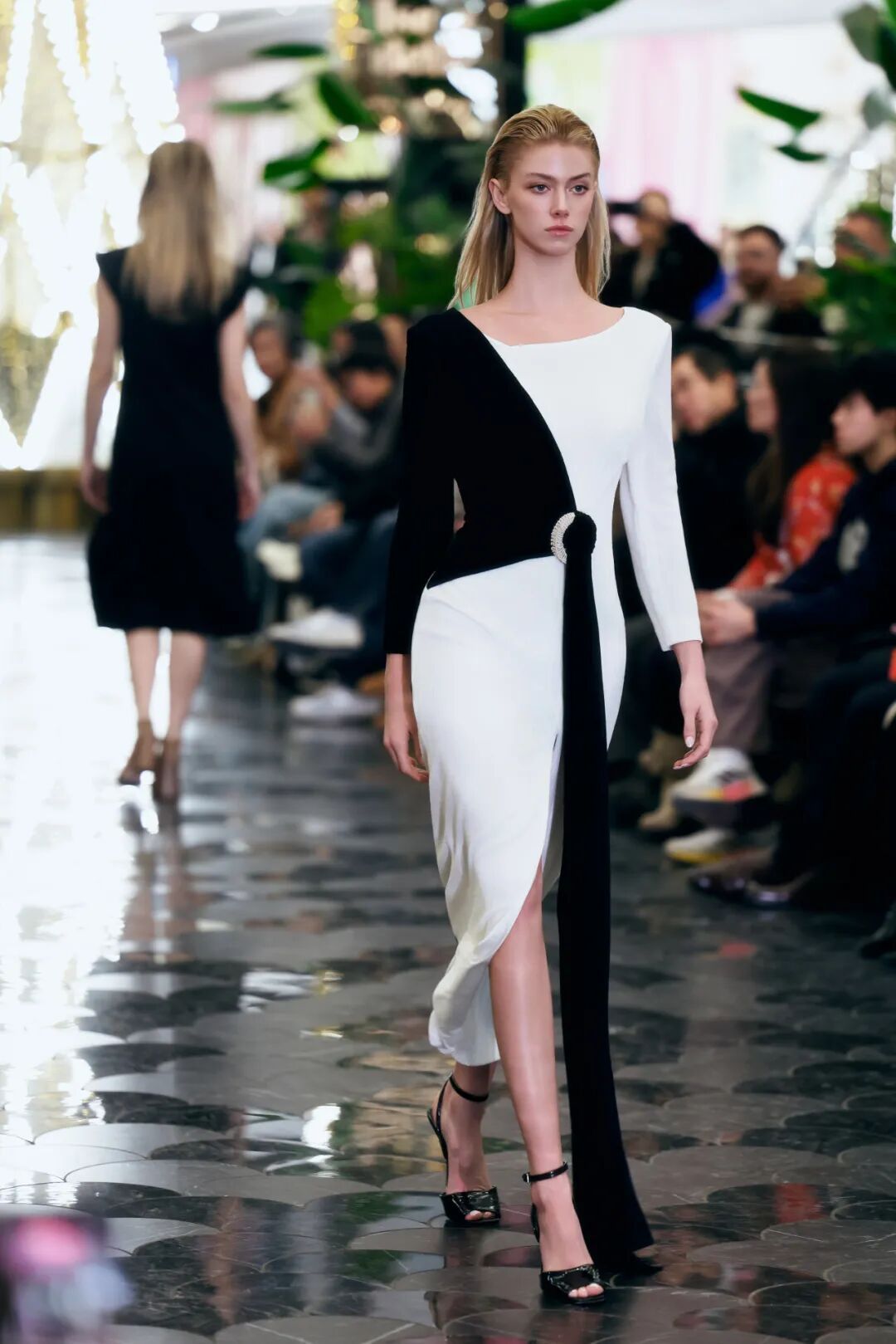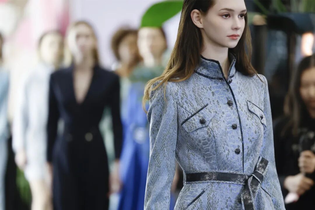 “点”聚焦人与本心的共振,如同细腻柔软的质地与如宝石般的纽扣,可以看到,垂顺的长裤与裙装采用弹力面料,让穿着者能在舒适状态下,更好展示真实自我的生命力。“线”聚焦人与人的沟通,通过流动的水波纹理与细腻的黑白拼接,诠释东方文明中的留白与分寸艺术以及“亲而有间,美美与共”的关系美学。“面”聚焦人与时空的交错,在融合手工非遗工艺与当代高级面料的层次中,承载了极具哲学与人文情怀的生活品质。