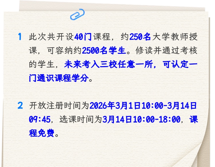 经过全新升级的三校携手“pro max”版周末先修学堂第六期,将迎来由三校开设的总计40门课程,可容纳约2500名学生。约250名大学教师参与授课,其中包括院士、文科资深教授等“大佬”。