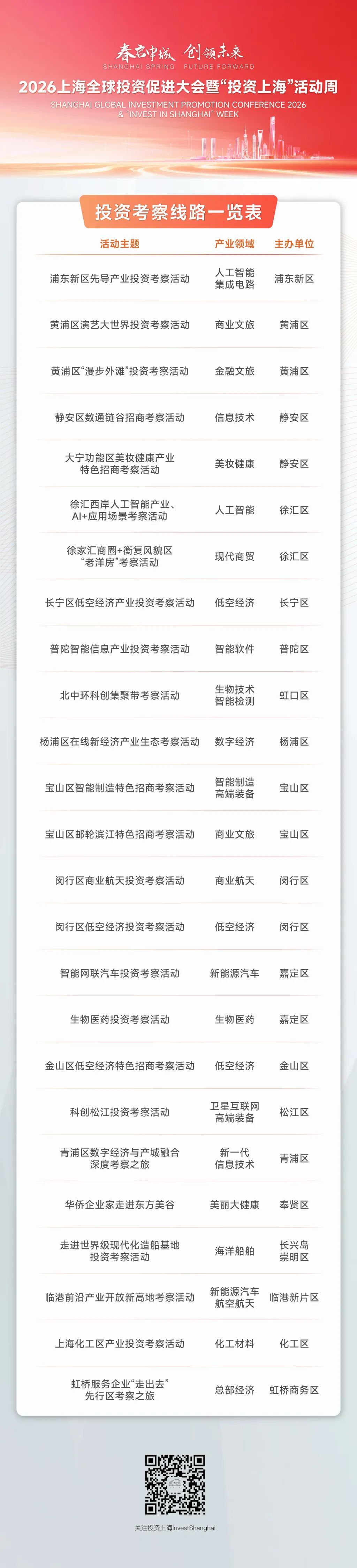 其中,主推介会将全景呈现上海投资新机遇,发布应用场景、公共服务平台、中试平台等赋能新质生产力新要素,集中推介一批重点地块。两场企业座谈会——科技创新企业座谈会和重点外资企业座谈会,则聚焦企业诉求,排忧解难。