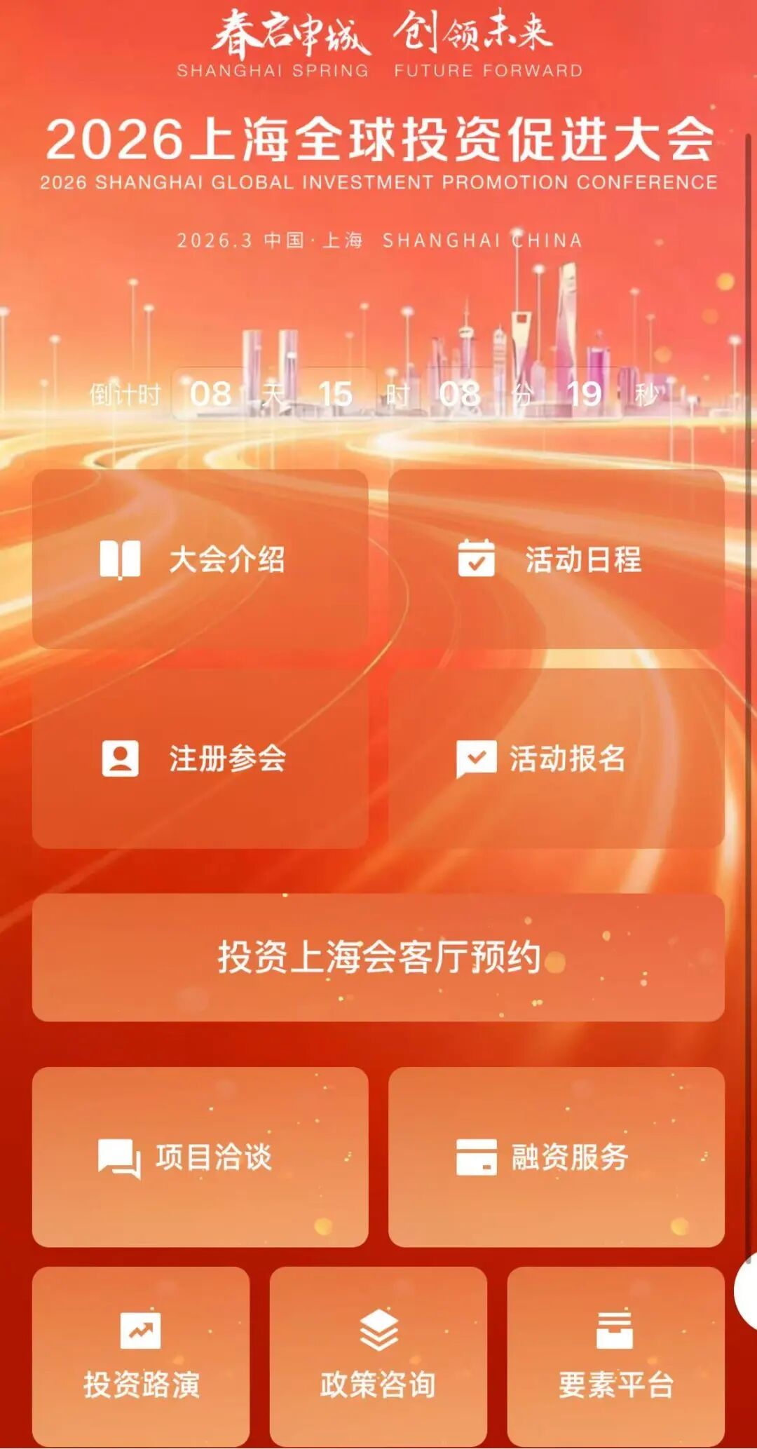大会特别设立“投资上海会客厅”,设置项目洽谈、融资服务、政策咨询、要素平台、投资路演五大专区,高效聚合政策、资本、产业等核心资源。参会嘉宾可通过线上会务系统,一键预约上海各区区长、上海产业政策制定者、头部投资机构实操人、创投机构合伙人等“关键人士”进行现场洽谈,精准遇见想见的人。