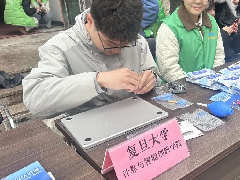 不仅是“软件教学”,一旁的学生正拿着精密螺丝刀和气吹,全神贯注地拆卸着一台老旧笔记本电脑,现场化身“赛博小哥”,熟练地为居民清理主板灰尘。