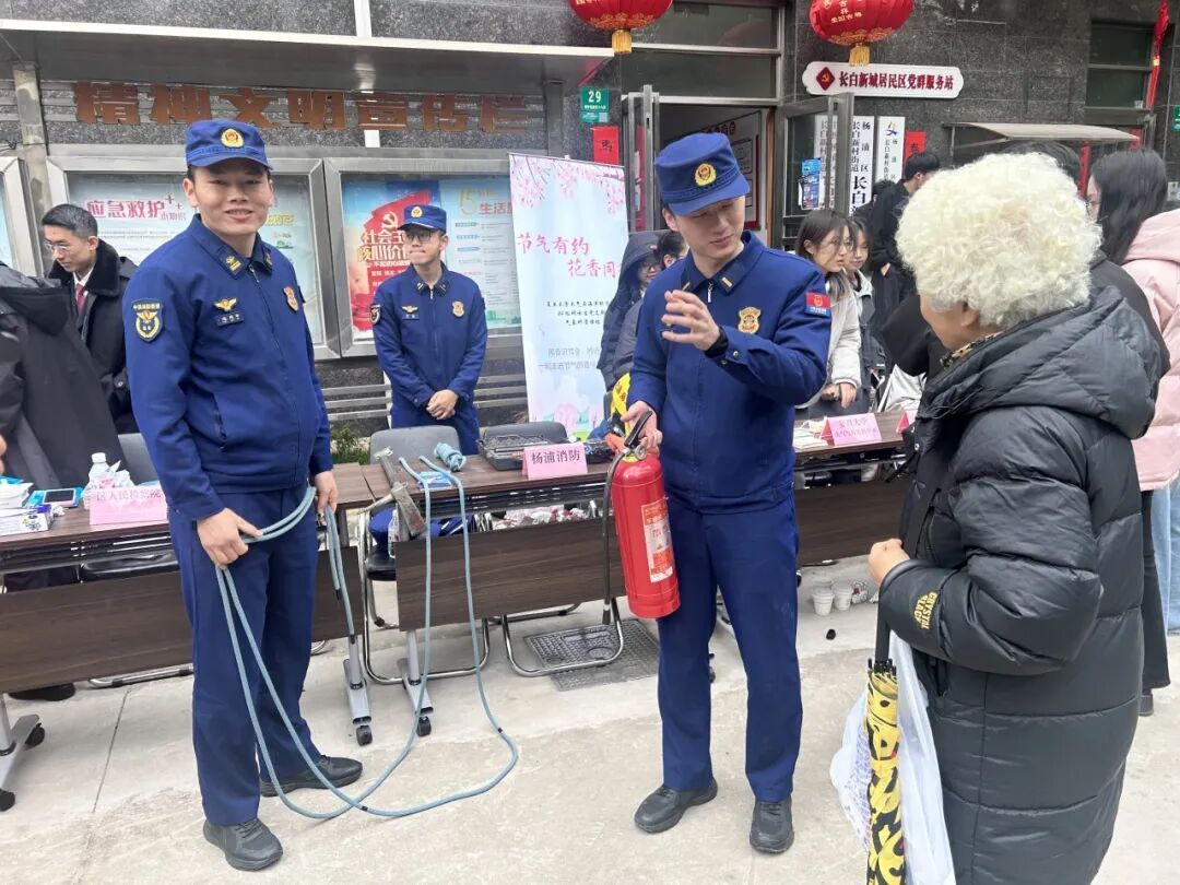 另一边,杨浦内江消防救援站的消防员正拿着蓝色救援绳,手把手教阿姨打逃生绳结。在灭火器演示环节,消防员拿着实物反复叮嘱:“压力表到了黄色区域代表压力偏大,虽然能用,但喷出来会比较激烈。用的时候第一步托住瓶身,先拔掉这根红色的保险销……”