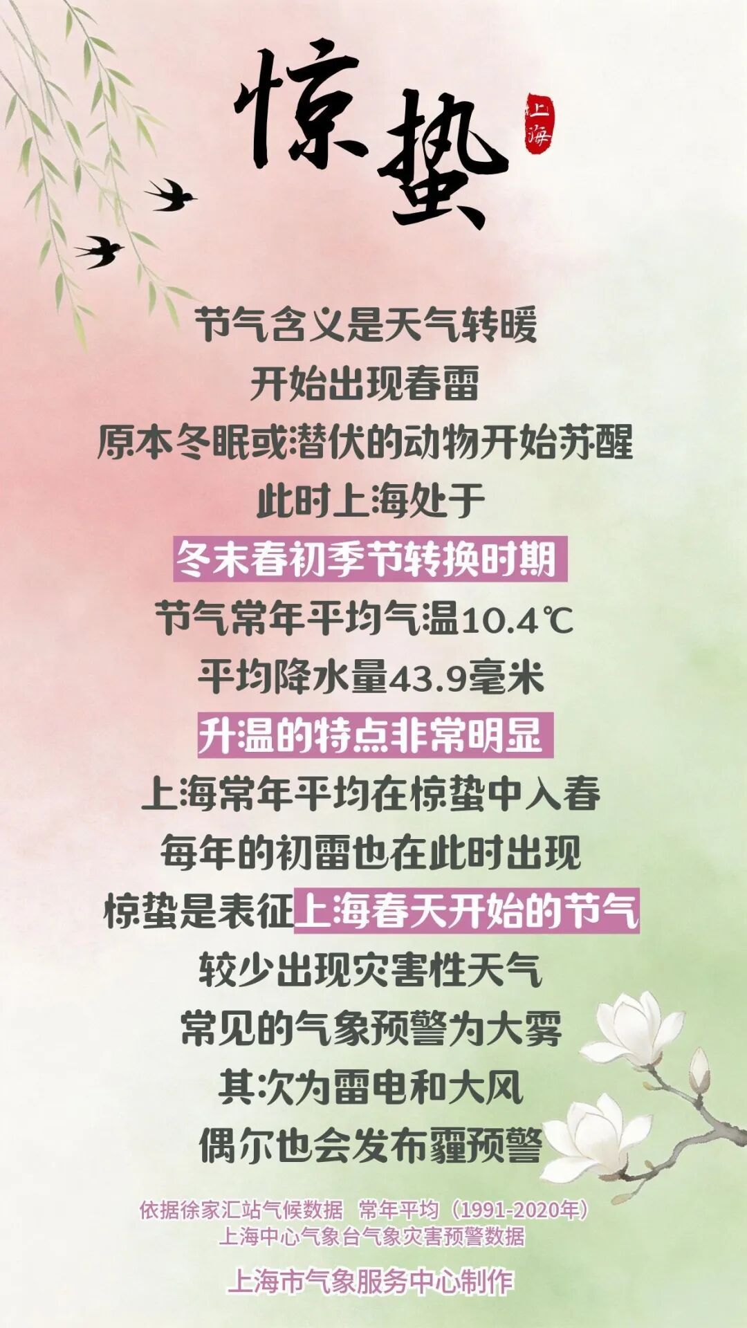 今天进入惊蛰节气,意思是天气转暖,开始出现春雷,原本冬眠或潜伏的动物开始苏醒 。惊蛰对上海来说是春天开始的节气。