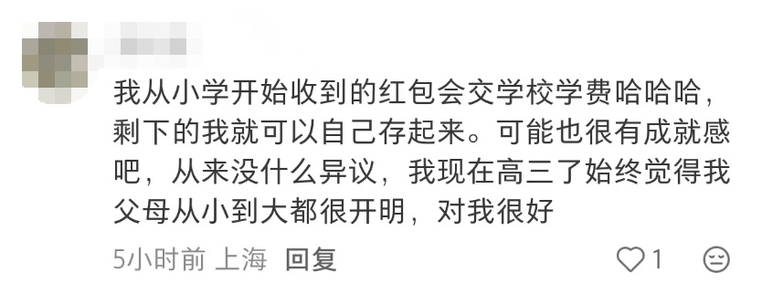 有网友说从小就是红包用来交学费剩下的自己存起来全家都没有异议 这个模式也真不错呀