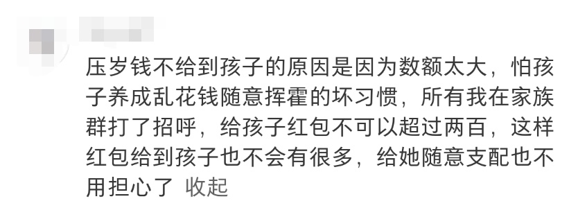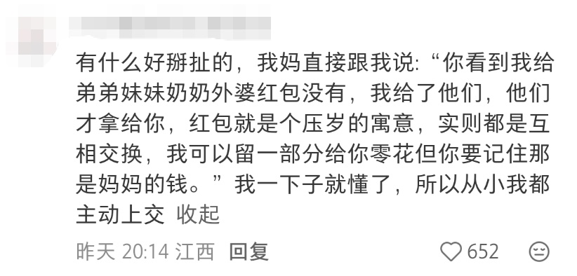 还有网友表示小时候妈妈的解释更加直白告诉她压岁钱是“互相交换来的”本质还是父母的钱所以她一直会主动上交