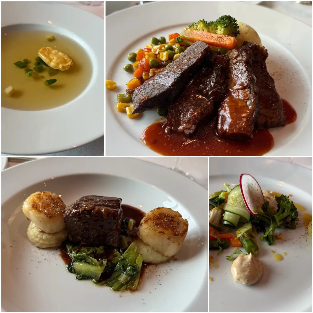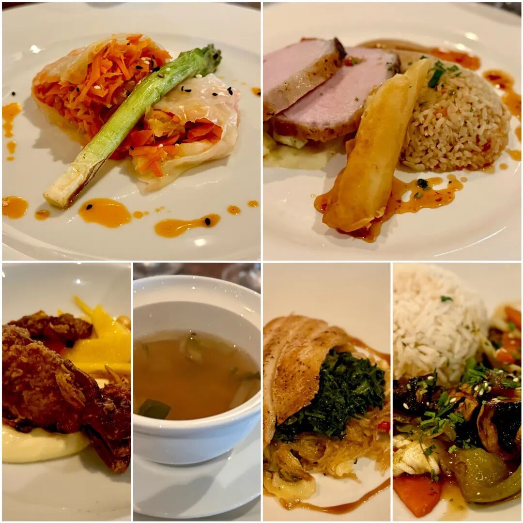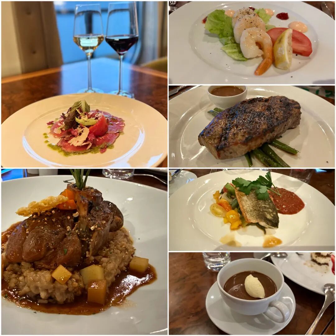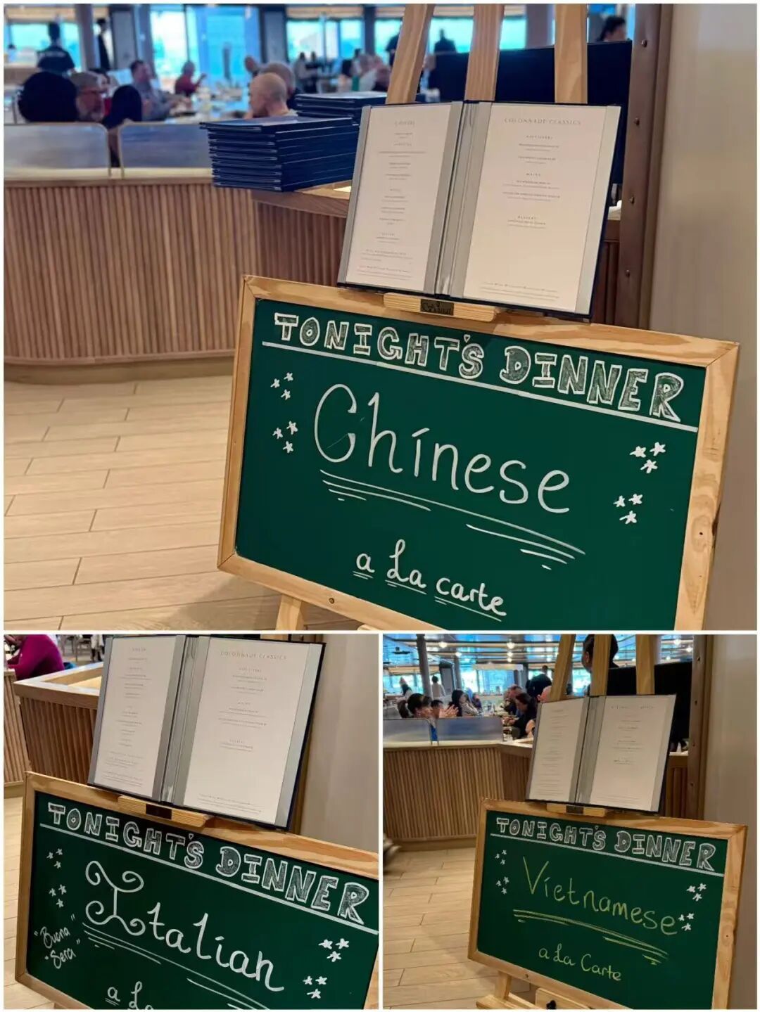 晚餐的话,全船九家餐厅和酒吧,主餐厅是四楼和五楼各一个。四楼是全球美食餐厅,相对正式一些,在那里你可以点到各国的主要美食。五楼中午做自助餐厅,晚上成为主题餐厅,每天晚上都会有一个“国家美食主题”: