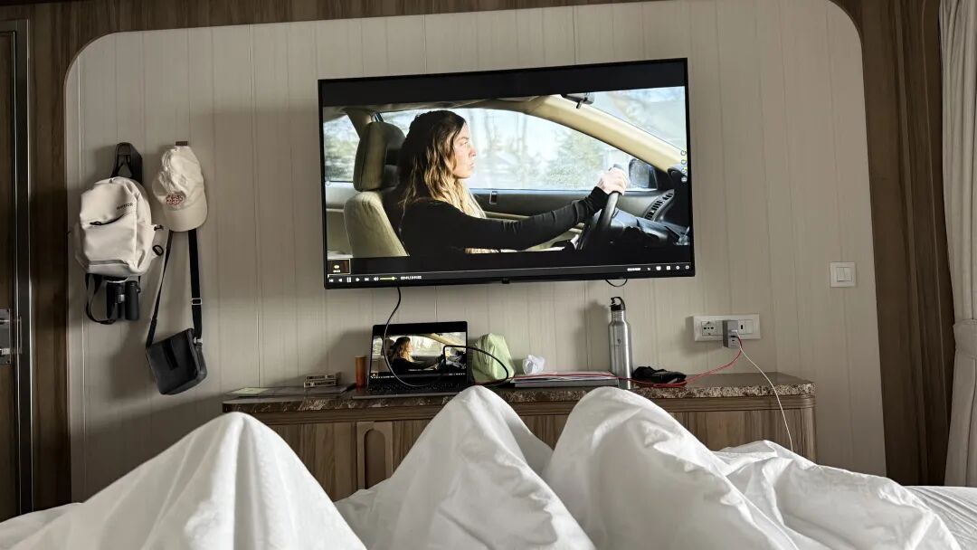 还有就是躺在床上,和老婆一起看带过去的电影。