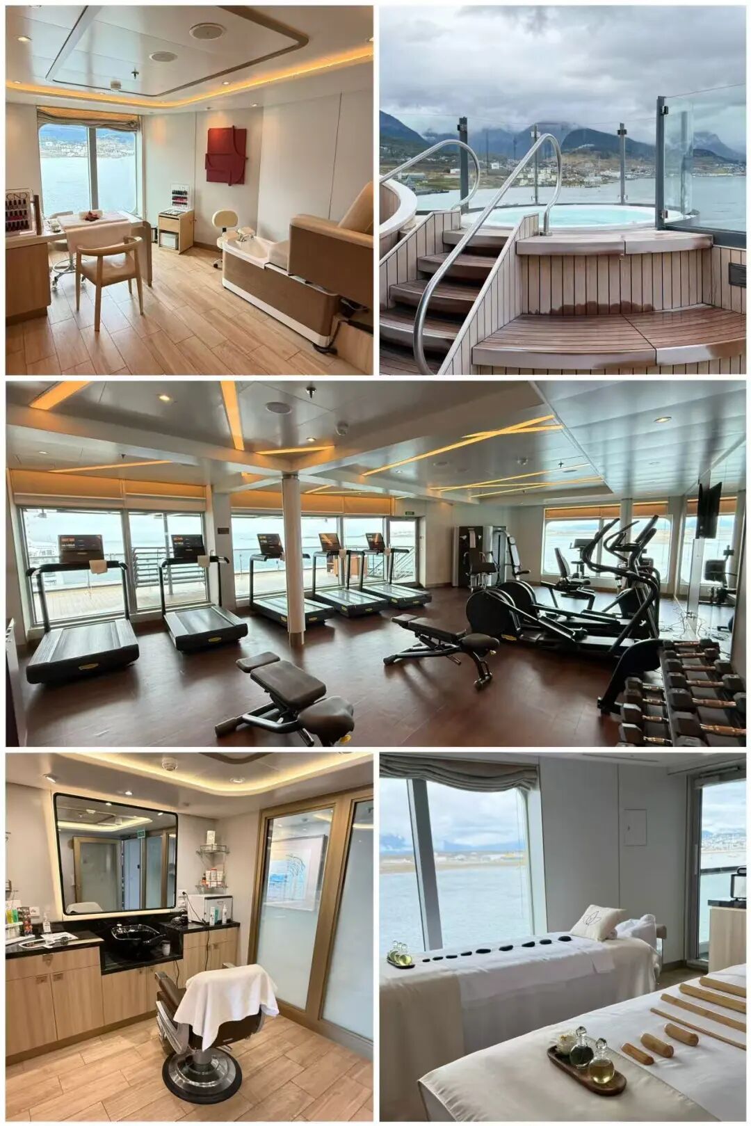 然后去参观了下船上的其他设施,该有的都有,包括还有美发和美甲的地方。SPA自然不会缺。泳池有一个无边的,热水泡池有四个。