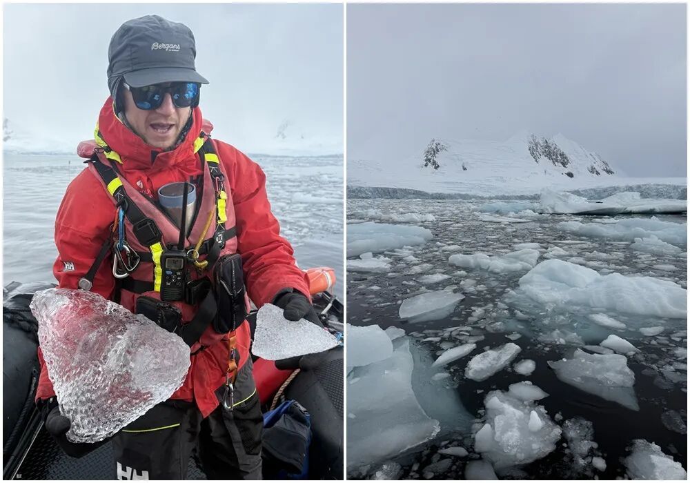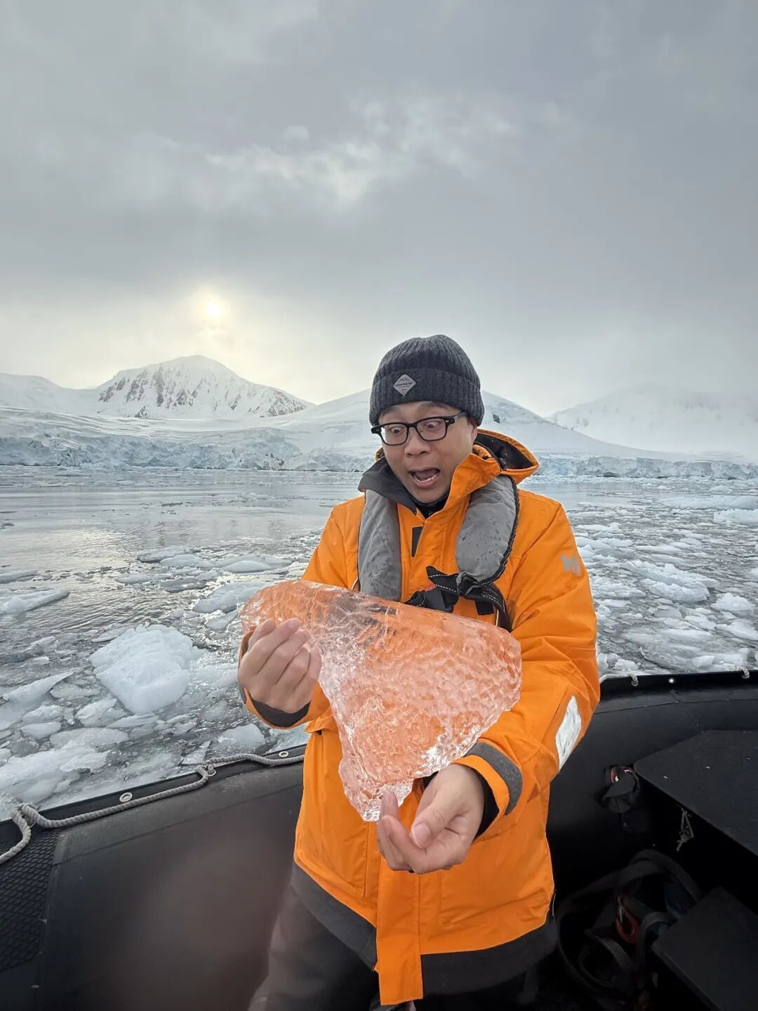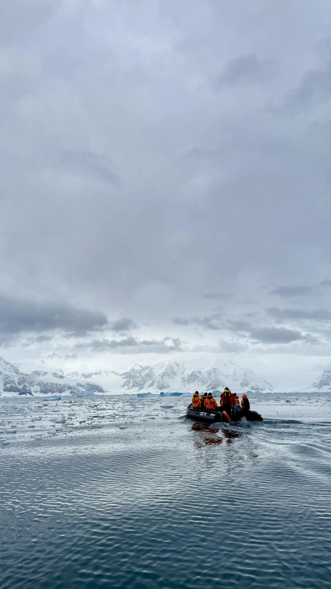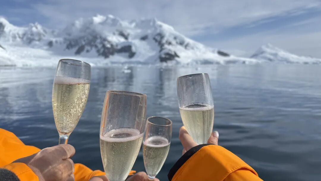 其实基本上到这时候,很难看到什么新奇景色了(当然,老景色还是非常美),所以游艇公司给每人送来了一杯香槟——在南冰洋的冲锋艇上喝香槟,也算是一种体验吧: