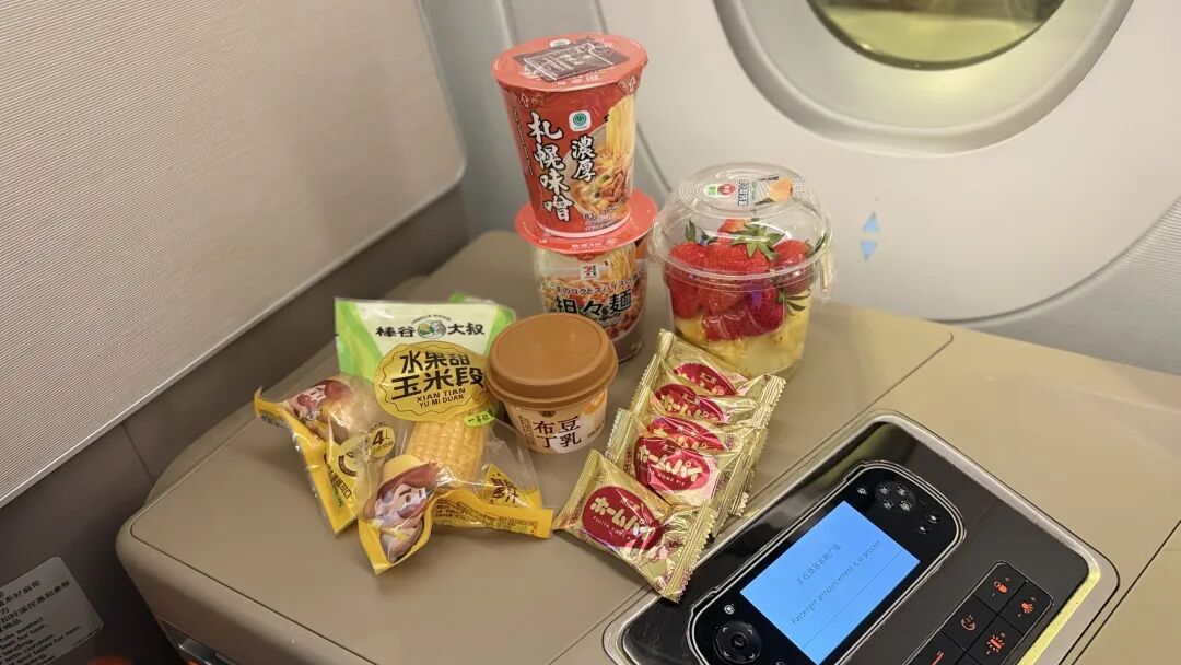 前提是:她在浦东机场的休息室里已经吃了一碗面,两个烧麦,一个玉米,然后这段航班是提供一顿正餐和一顿早餐的,结果快着陆的时候,她基本上还是把这些零食都消灭了。