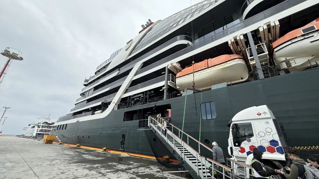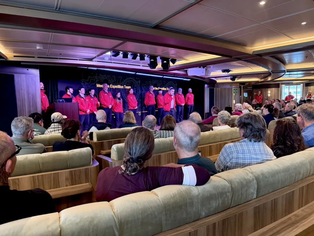 "世邦”旗下有好几艘船,我们这艘是“追寻者”号(Pursuit),排水量23000多吨,PC6 极地冰级;配24 艘冲锋艇,皮划艇、潜水 / 浮潜装备,配备 2 艘 6 人定制潜水艇;同时有 24 名专业探险队员团队(含科学家、博物学家、摄影师等),并设 Discovery 中心、极地实验室。