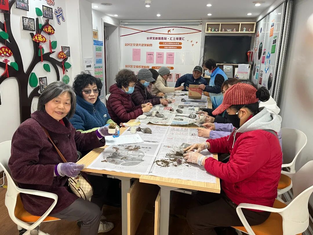 本次活动还设置了一个轻松有趣的环节——多肉植物盆景种植。在完成户外绿植移栽后,居民们又移步活动室,挑选喜欢的多肉品种,搭配小花盆,完成一盆属于自己的“迷你花园”。把这些小盆景带回家,也把绿意与春意一同带进生活。
