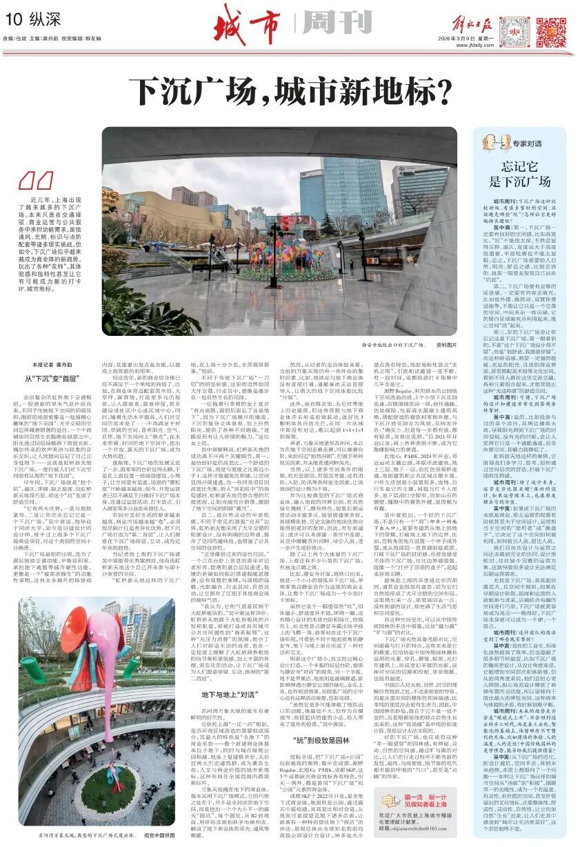 吴中寅:从下沉广场的进化,到设计避坑、空间手法,再到未来趋势,本质上都指向了一个问题——如何让下沉广场这样的城市空间从“消极”到“积极”,摆脱单一的功能性,成为一个有温度、有灵性、有价值的空间,甚至价值溢出的文化地标。注重整体性、舒适性、灵动性、自然性,让它仿如自然“生长”出来,让人们在其中感受到“城市让生活更美好”,这个宗旨始终不变。 (来源:解放日报)