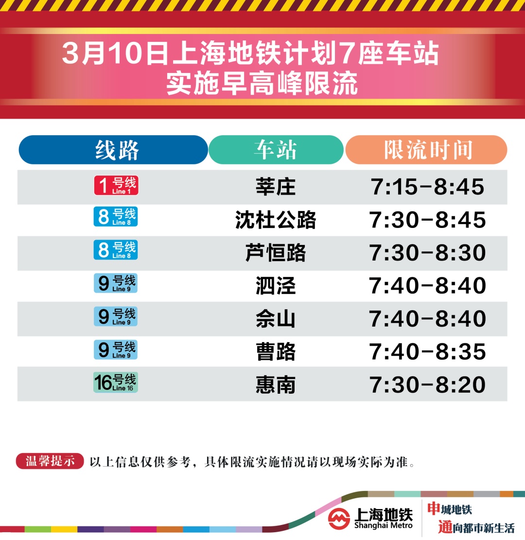 3月10日早高峰莘庄、佘山等7座地铁站计划限流