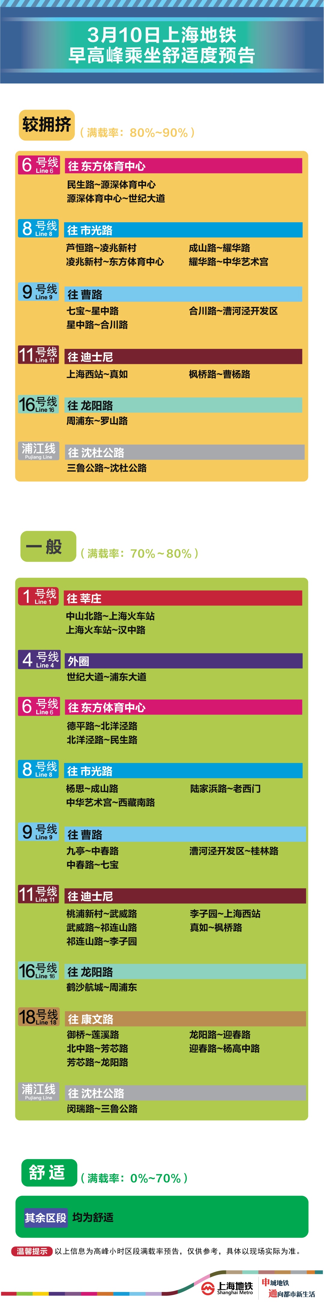 为提升上海地铁早高峰期间出行服务水平,提升乘客乘坐体验,上海地铁向乘客提供乘坐舒适度预告,方便乘客提