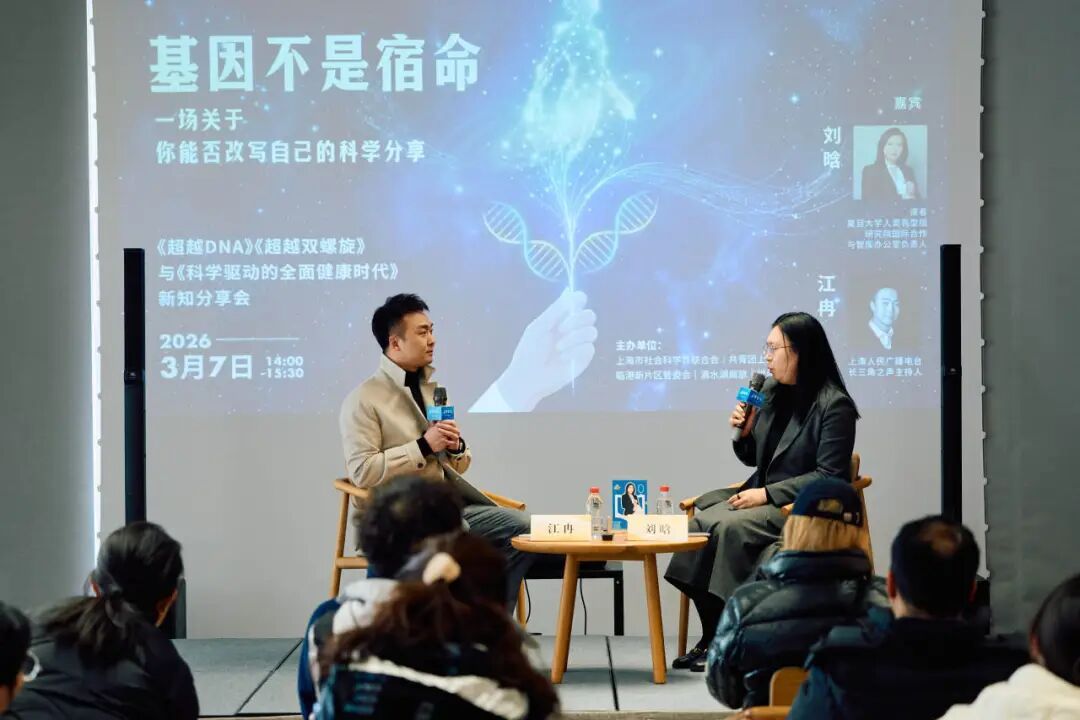 这场分享会是“理润申城|理论临距离”2026年举办的新一期活动,由上海市社会科学界联合会、共青团上海市委员会、临港新片区管委会、滴水湖商旅、世纪朵云主办,联手搭建“望道讲读会·湖畔青创读书会”科普平台,邀请复旦大学人类表型组研究院国际合作与智库办公室负责人刘晗与上海人民广播电台长三角之声主持人江冉展开深度对谈。两位嘉宾围绕表观遗传学等前沿科学领域,探讨基因之外的生命调控机制,揭示饮食、睡眠、情绪等日常因素如何悄然参与对人体健康的“重新编程”。
