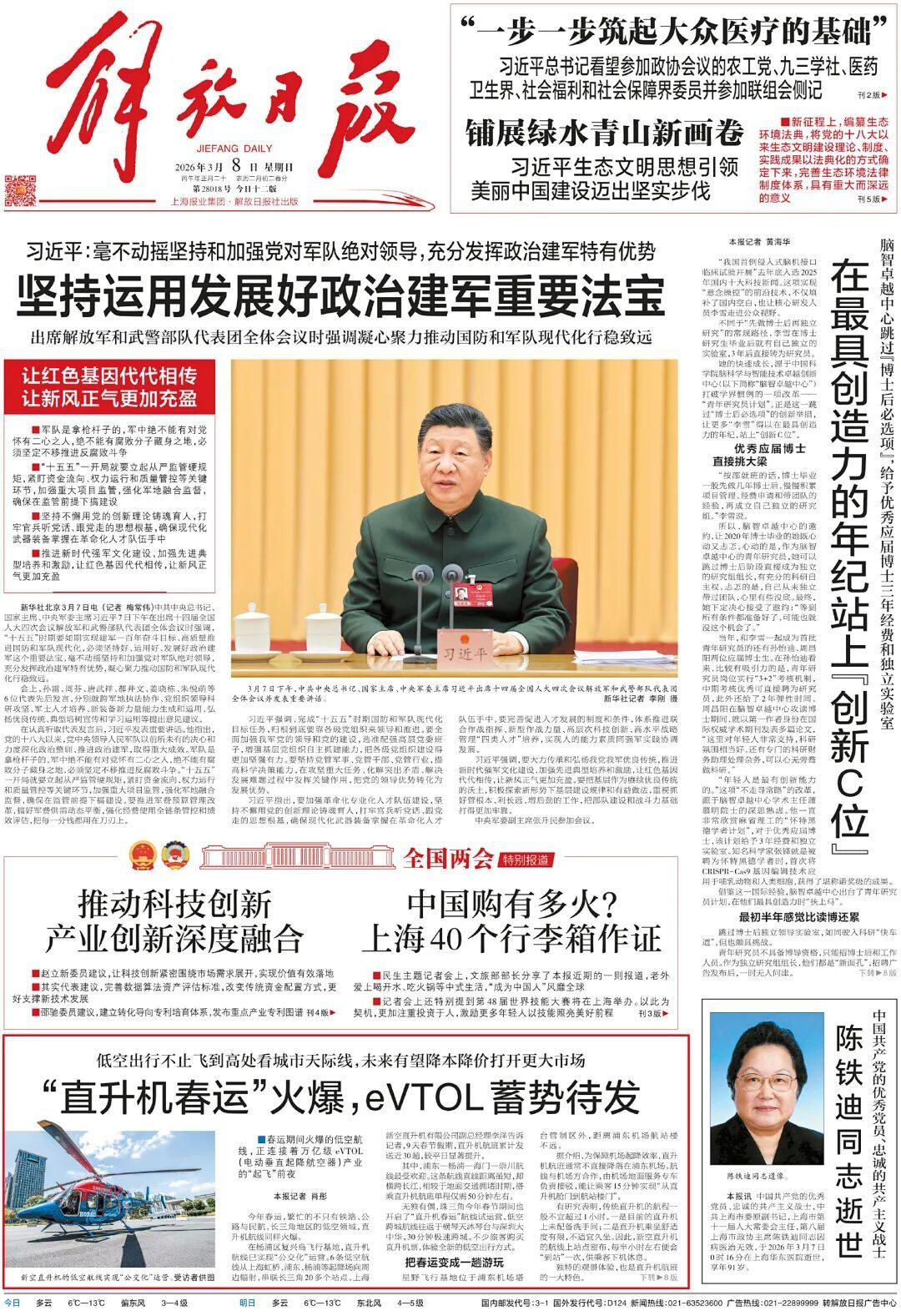 3月8日,《解放日报》头版刊文《“直升机春运”火爆,eVTOL蓄势待发》,报道聚焦春运期间火爆的低空航线,在杨浦区复兴岛飞行基地,直升机航线已实现“公交化”运营,6条低空航线串联长三角20多个站点。一起来阅读全文↓