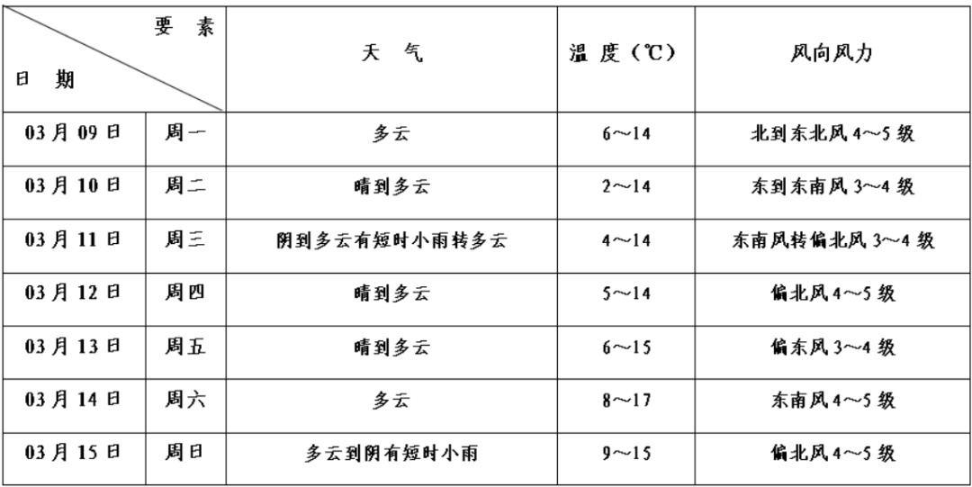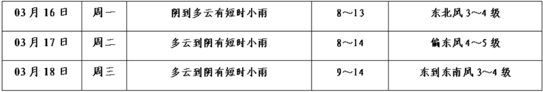 本周三云系增多,会出现短时小雨。周四至周六转为晴或多云的好天气,气温一路上扬,预计周六最高气温接近17℃,暖意融融。周日开始,天气形势有所调整,阴雨天气增多,气温小幅下滑。早春时节天气多变,请大家及时关注最新的预报信息。