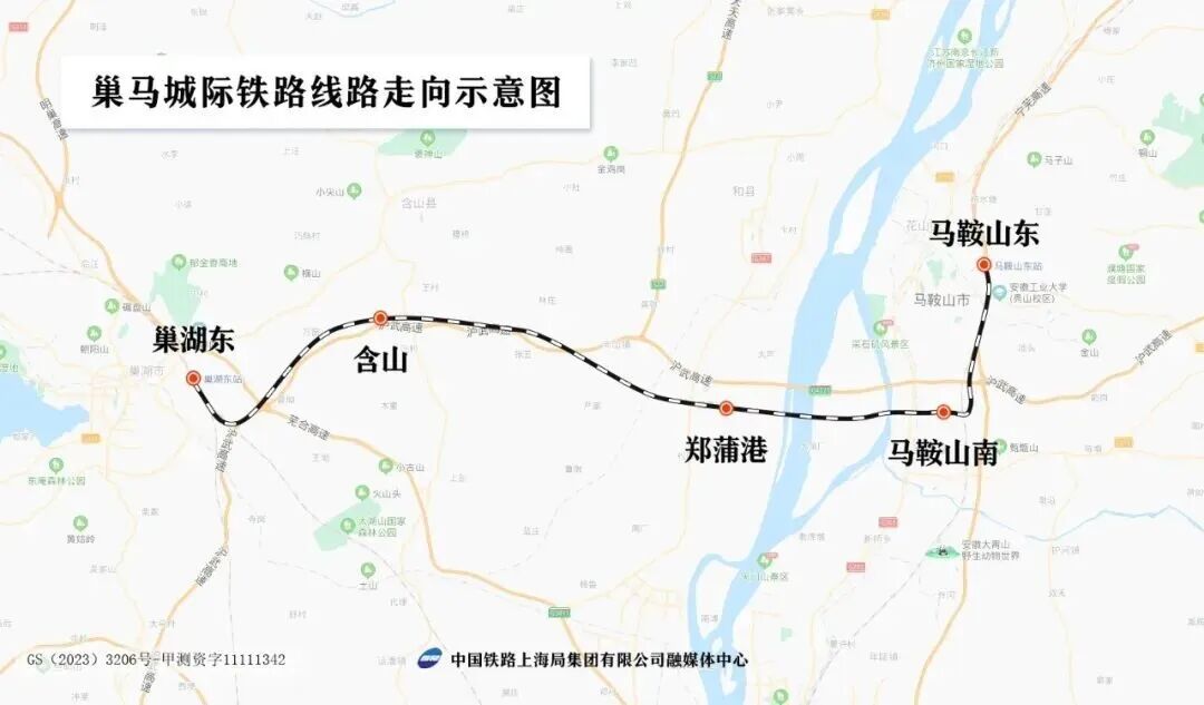 巢马城际铁路北起巢湖东站,南至马鞍山东站,正线全长约61公里,设计时速350公里。全线共设巢湖东、含山、郑蒲港、马鞍山南、马鞍山东5座车站,其中含山、郑蒲港、马鞍山南为新建车站。