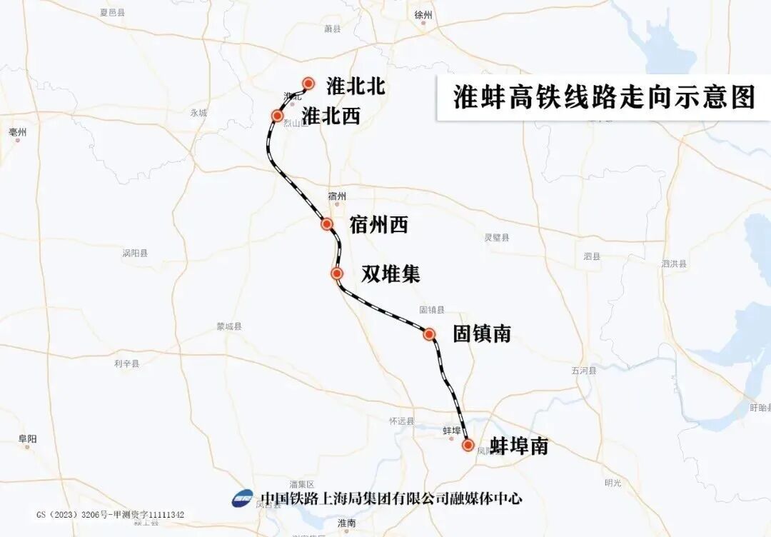 淮蚌高铁地处皖北平原,线路北起淮萧联络线淮北北站,向南经淮北、宿州、蚌埠三市,终至蚌埠南站。新建正线全长约161公里,设计时速350公里,全线设淮北北、淮北西、宿州西、双堆集、固镇南、蚌埠南6座车站。其中,淮北北站和蚌埠南站为既有车站,其他为新建车站。
