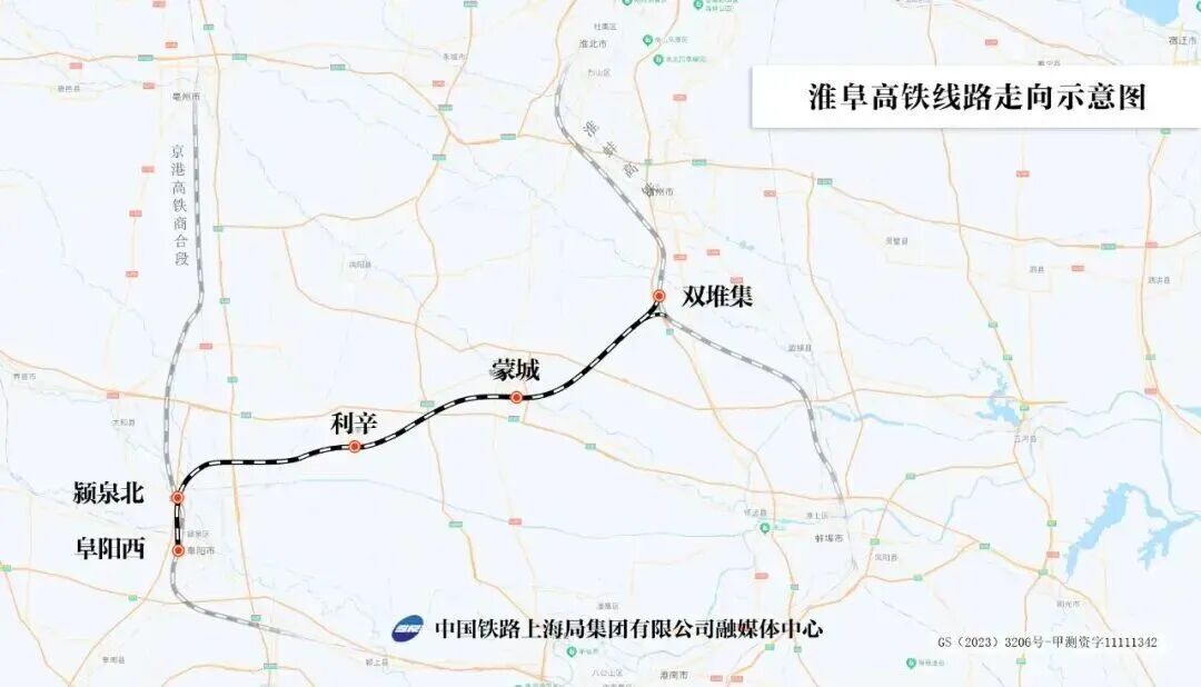 淮阜高铁线路接轨淮蚌高铁双堆集站至淮北方向,设联络线衔接蚌埠方向,往西南行经蒙城与亳州方向沟通,经利辛引入阜阳西站。线路正线长142.436公里,设计时速350公里,新建蒙城、利辛、颍泉北等3座车站,扩建阜阳西站。