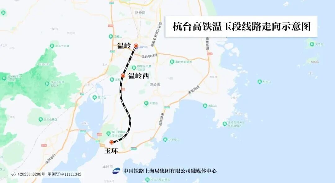 杭台高铁温玉段是2022年1月开通运营的杭台高铁的延伸线路,位于台州市南部,途经温岭、玉环两市,新建正线约37公里,设温岭、温岭西、玉环3个车站,设计时速350公里。