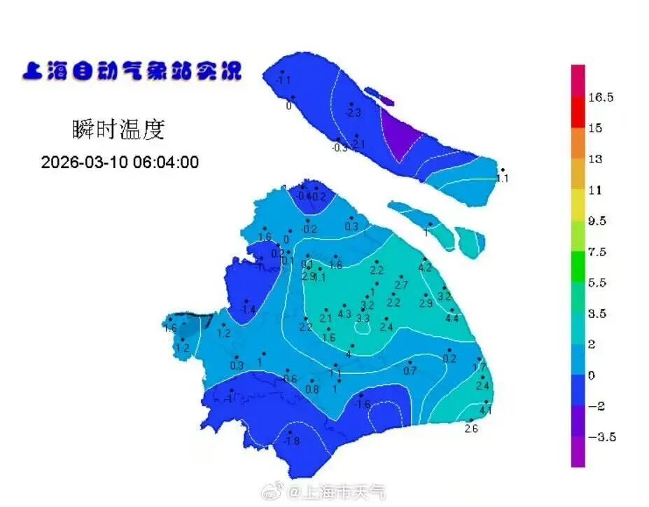 今天(3月10日)晴到多云为主,早晨辐射降温作用明显,气温跌至近期低点,市区最低气温仅4℃左右,郊区-2℃~0℃,局部地区有薄冰,上午随着阳光上线,最高气温将升至13℃。相对湿度80%~35%,东到东南风3~4级,风比昨天温和一些。