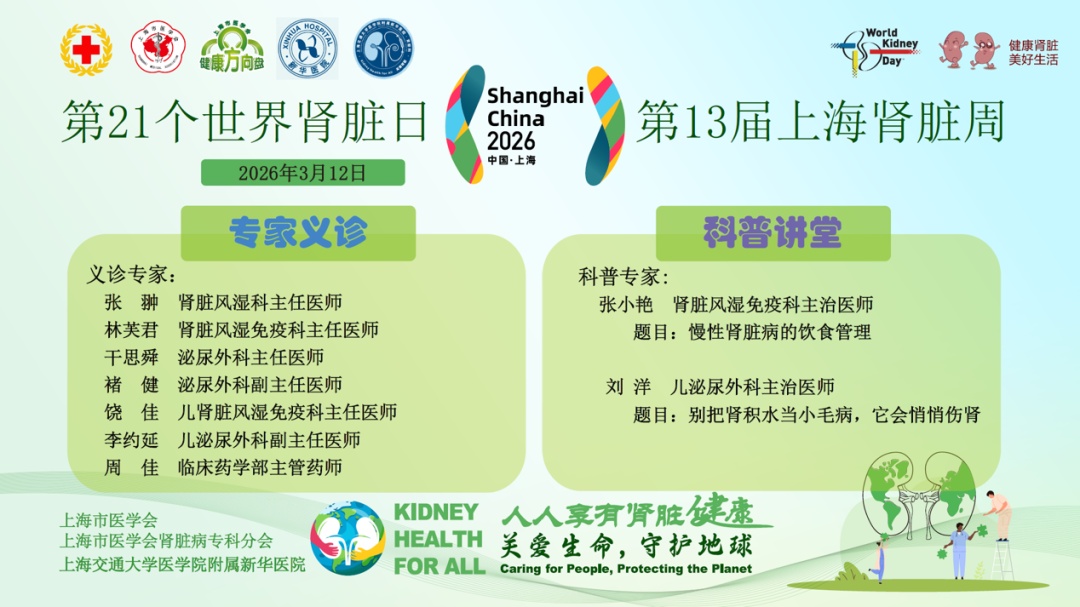 新华医院肾脏风湿免疫科联合泌尿外科、儿肾脏风湿免疫科、儿泌尿外科、药学部等多学科专家团队将亲临义诊现场,为市民及患者提供一对一深度咨询、专业健康筛查及个体化用药指导。活动聚焦肾脏病全周期管理,通过精准诊疗建议与慢病科普服务,全方位守护您的肾脏健康。