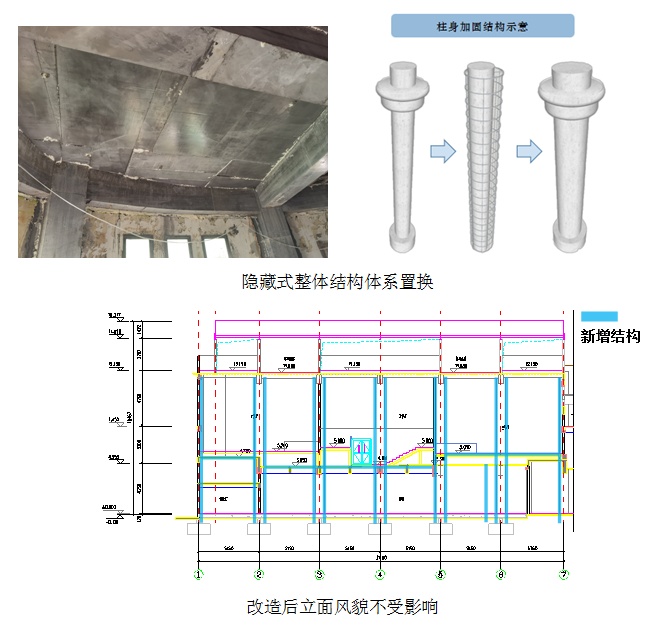 某历史建筑为地上三层钢筋混凝土框架结构,因原结构历经百年,病害十分严重,都是du级危险构件。因此,在改造时,不考虑原结构的承载力,而是完全采用新结构承载。为保护风貌及减小改造过程风险,原结构不拆除,但要对新结构进行隐藏。