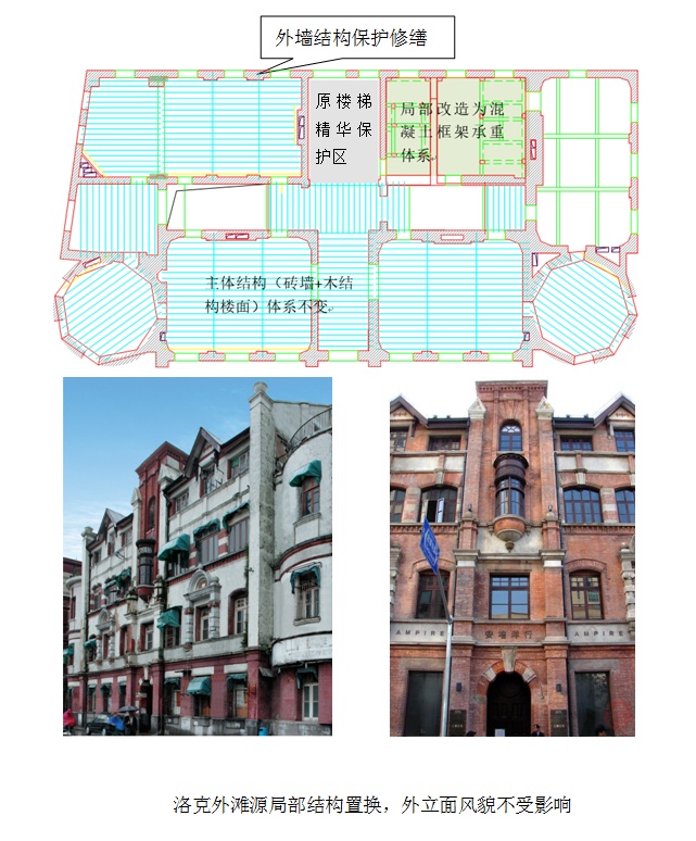 洛克外滩源的安培洋行,为上海三类优秀历史建筑,属砖木结构。按照分级保护要求,其外立面、楼梯和部分天花吊顶为重点保护部位,需严格保留原貌。结合建筑功能更新需求,部分楼面要改造为电梯间和卫生间。改造严格遵循“局部改造、不破坏核心风貌”的原则,仅拆除该部位的木结构楼面,局部置换为钢筋混凝土框架结构,主体结构体系保持不变,确保外立面风貌不受影响。