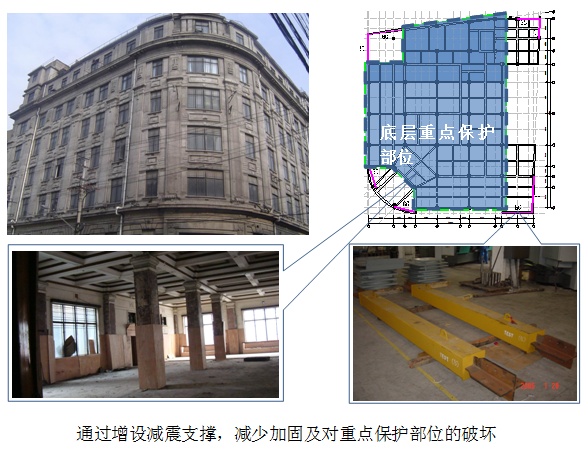 阻尼器支撑是进行结构体系加固的有效手段,可以提高整体结构的抗震性能,其效果和效率都比逐个构件加固要高得多。这时对原建筑的干扰集中在局部范围,从而对风貌保护十分有利。阻尼器支撑作为高效的结构体系加固手段,已广泛应用于上海各类历史建筑抗震加固工程,实现安全加固与风貌保护的双重目标。