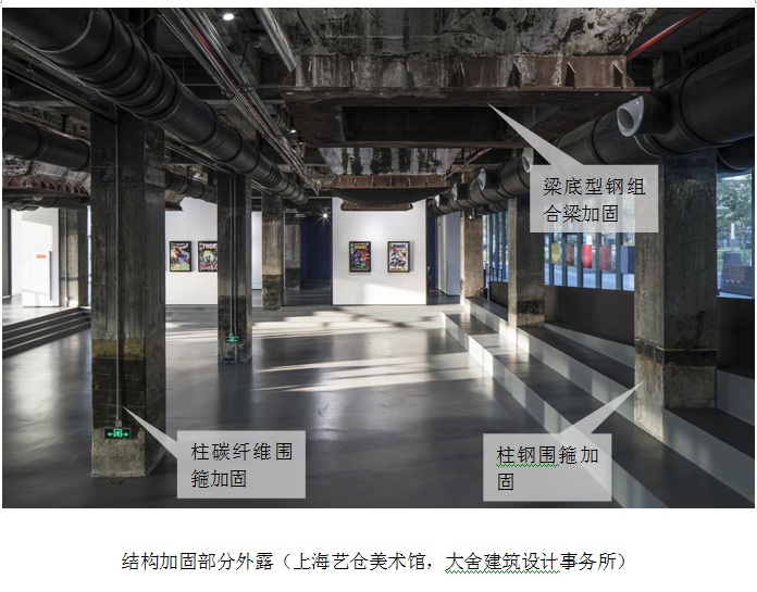 上图为上海艺仓美术馆开发使用的场景照片。从中可以看出,大量的加固痕迹未被覆盖,而是直接外露。体现了建筑师的独特风格和创作自信。