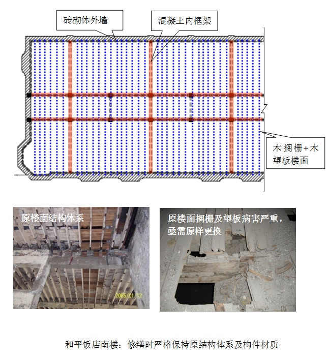 和平饭店南楼为国家级文物建筑,同时属于上海市优秀历史建筑,因此修缮工作严格遵照修旧如旧的要求,对破损严重的构件进行更换,确保建筑的立面、结构体系、平面布局和重点保护装饰均不改变。针对原木搁栅病害(腐朽、虫蛀)严重,更换时仍旧采用原来的材质——美国花旗松(Douglas Fir)。