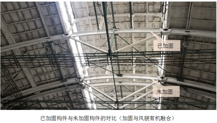 工业遗产类的历史建筑厂房,室内风貌与立面风貌同样是保护的重点。此时加固核心是实现加固工程与建筑原始风貌的有机融合,严格遵循“可识别、不突兀”的原则,加固措施与建筑原始风貌相协调,不特意隐藏、不刻意凸显,既保障构件安全,又融入建筑历史风貌之中,等待沉淀为历史的见证,完全契合《上海市历史文化风貌区和优秀历史建筑保护条例》中“保护建筑历史风貌完整性”的要求。从下图加固前后对比可以看出,已加固构件与未加固构件视觉统一,实现了安全加固与风貌保护的一体化。