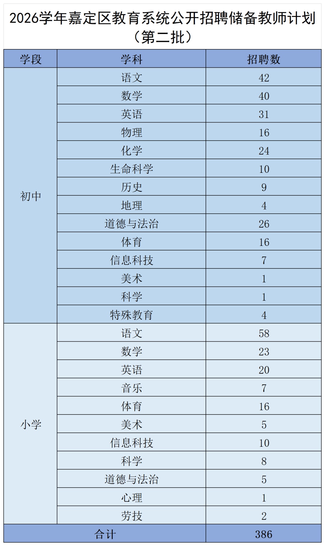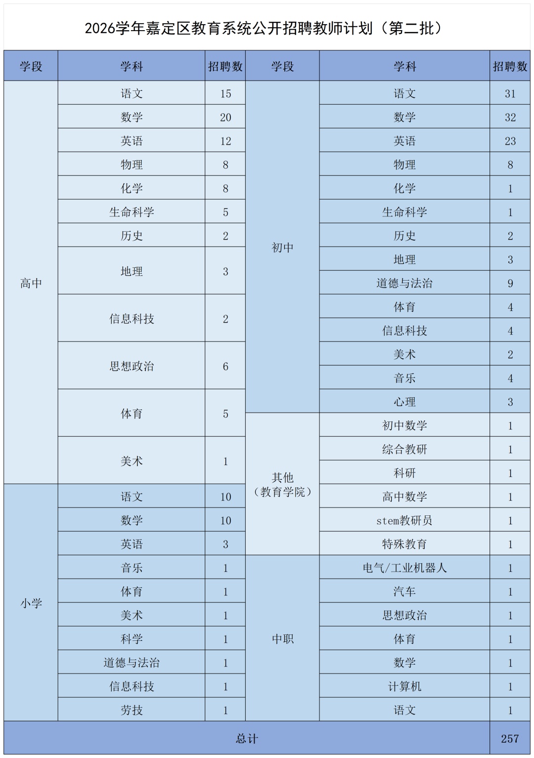 根据上海市人力资源和社会保障局《关于印发<上海市事业单位公开招聘人员办法>的通知》(沪人社规〔2019〕15号)及《上海市嘉定区人民政府关于转发<嘉定区公办中小学(幼儿园)教育人才蓄水池储备教师招聘与管理实施办法(试行)>的通知》(嘉府办发〔2023〕19号)文件精神,为加强师资力量,建设一支高素质、专业化的师资队伍,嘉定区教育系统面向社会公开招聘教师。2026学年第二批计划招聘事业编制教师257名、储备教师386名。